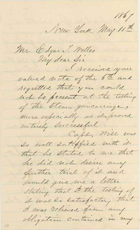 (1820 - 1887) American engineer and inventor responsible for the Union's quickly-built fleet of ironclads, delivering them in 65 days. Fine content A.L.S. 3pp. 8vo., New York, May 11, 1867, in part: "...[I] regretted that you could not be present at the testing of the steam gun carriage...as it proved entirely successful...I was relieved from any obligation contained in my proposition for constructing it...there are several members of the Engineer Corps of the Army who desire to witness it...the gun was fired 4 times in less than 5 minutes, and can be fired, I am sure every 45 seconds - 55 lb. charges were used with solid shot...". Fine condition.