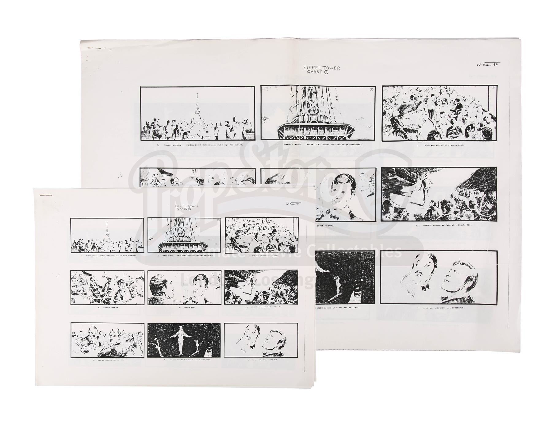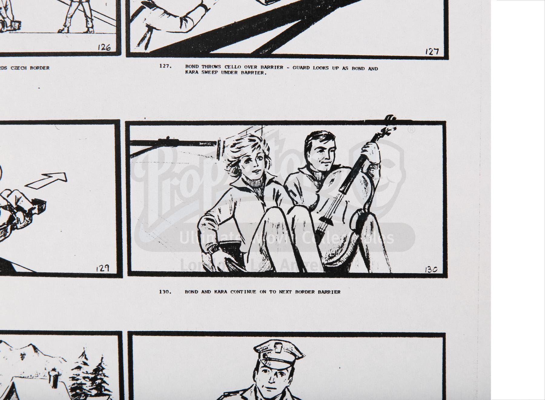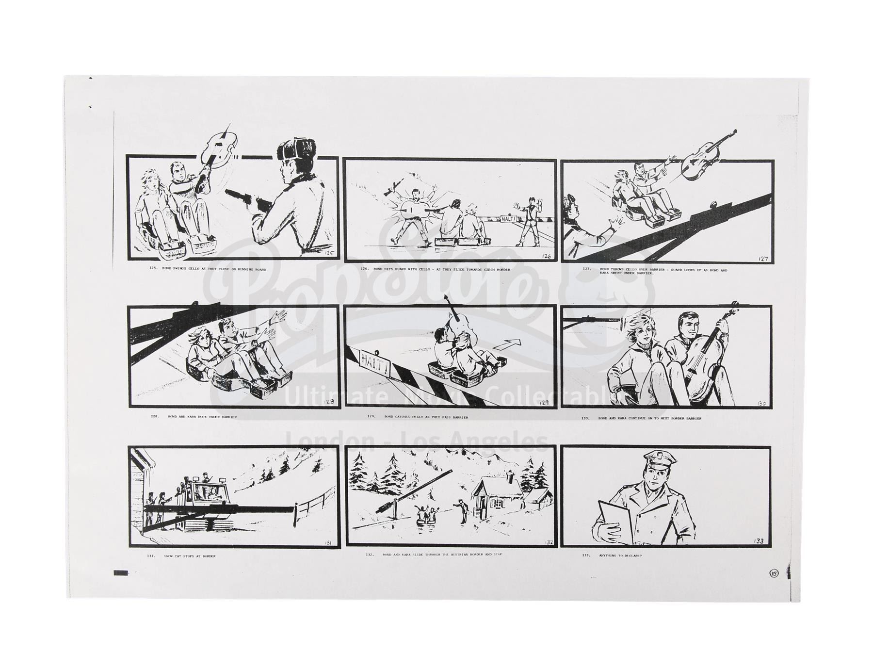 This set consists of 392 storyboards in total: 70 large boards from The Living Daylights depicting stunts, including Bond's (Timothy Dalton) Russian aeroplane manoeuvre; 101 boards from A View to a Kill, plotting such ambitious scenes as Bond (Roger Moore) tying Zorin's (Christopher Walken) airship to the Golden Gate Bridge; 95 smaller storyboards from The Living Daylights, of which 75 are bound with a blue spine bar; and 126 from A View to a Kill illustrating sequences, including Bond pursuing May Day (Grace Jones) after her assassination of Achille Aubergine (Jean Rougerie) at the Eiffel Tower.