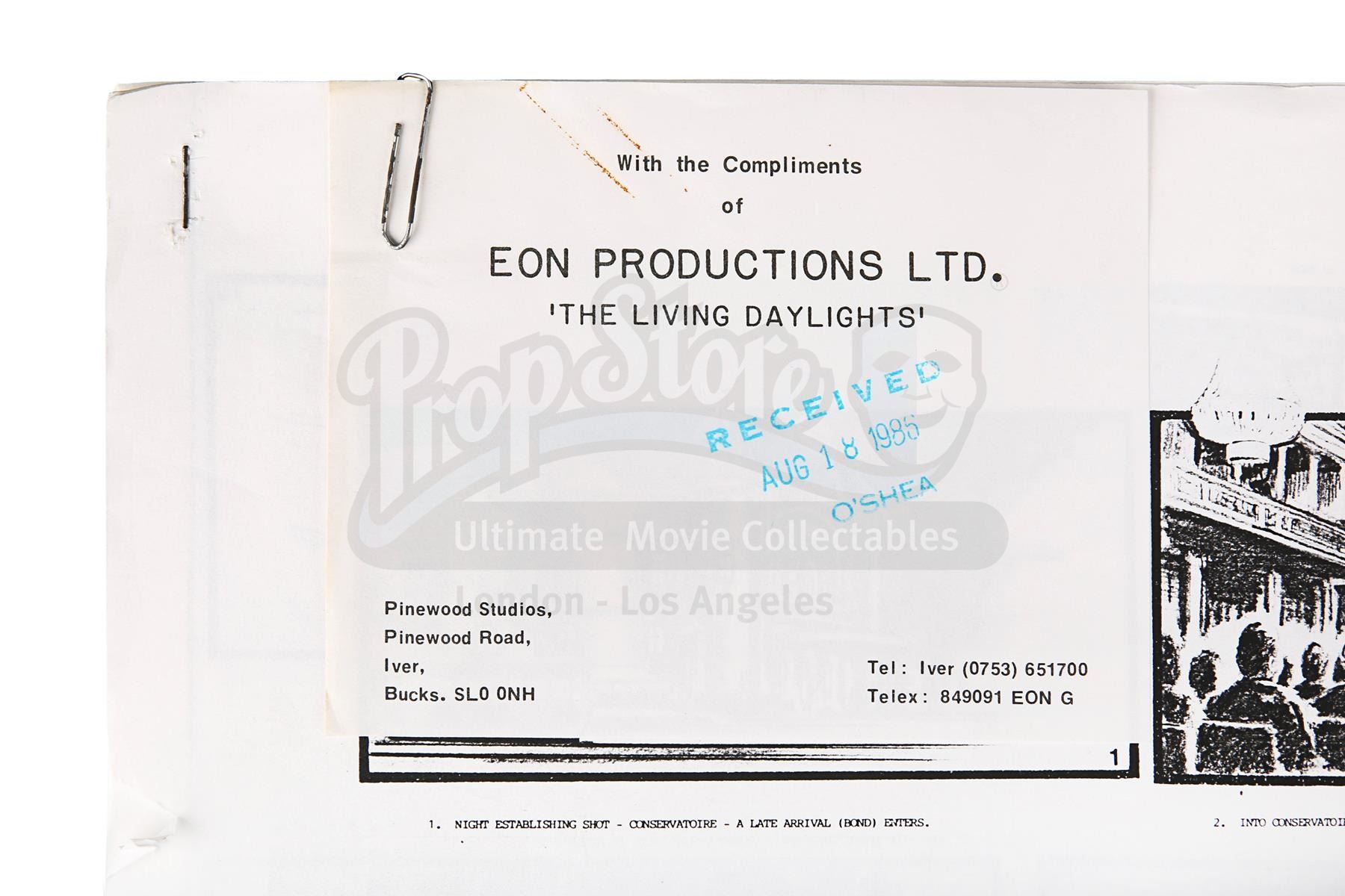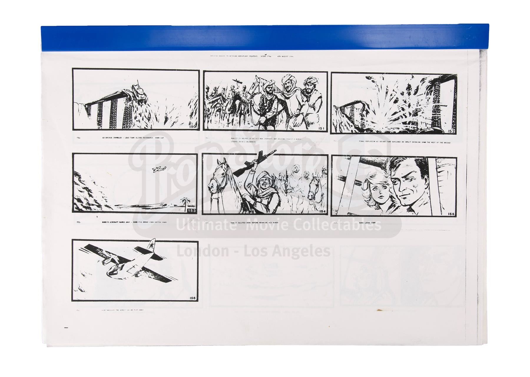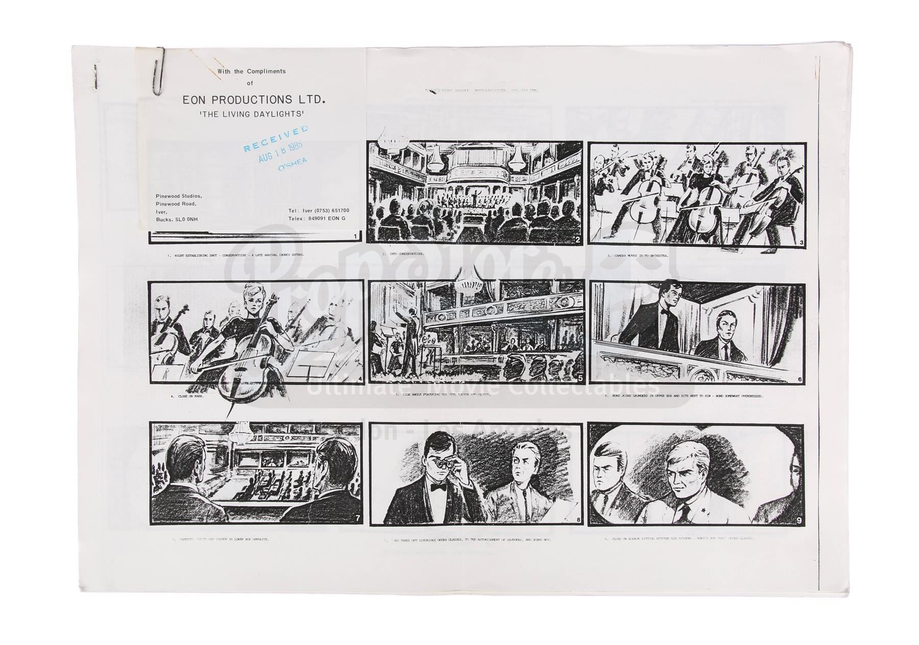 This set consists of 392 storyboards in total: 70 large boards from The Living Daylights depicting stunts, including Bond's (Timothy Dalton) Russian aeroplane manoeuvre; 101 boards from A View to a Kill, plotting such ambitious scenes as Bond (Roger Moore) tying Zorin's (Christopher Walken) airship to the Golden Gate Bridge; 95 smaller storyboards from The Living Daylights, of which 75 are bound with a blue spine bar; and 126 from A View to a Kill illustrating sequences, including Bond pursuing May Day (Grace Jones) after her assassination of Achille Aubergine (Jean Rougerie) at the Eiffel Tower.