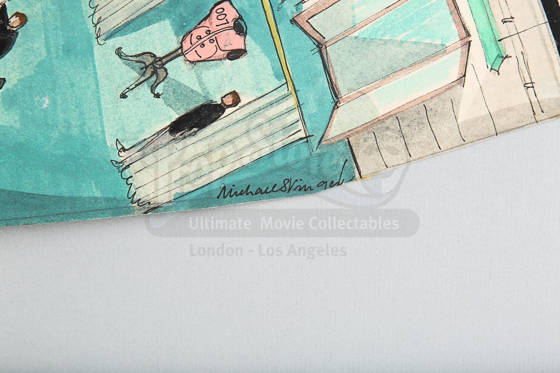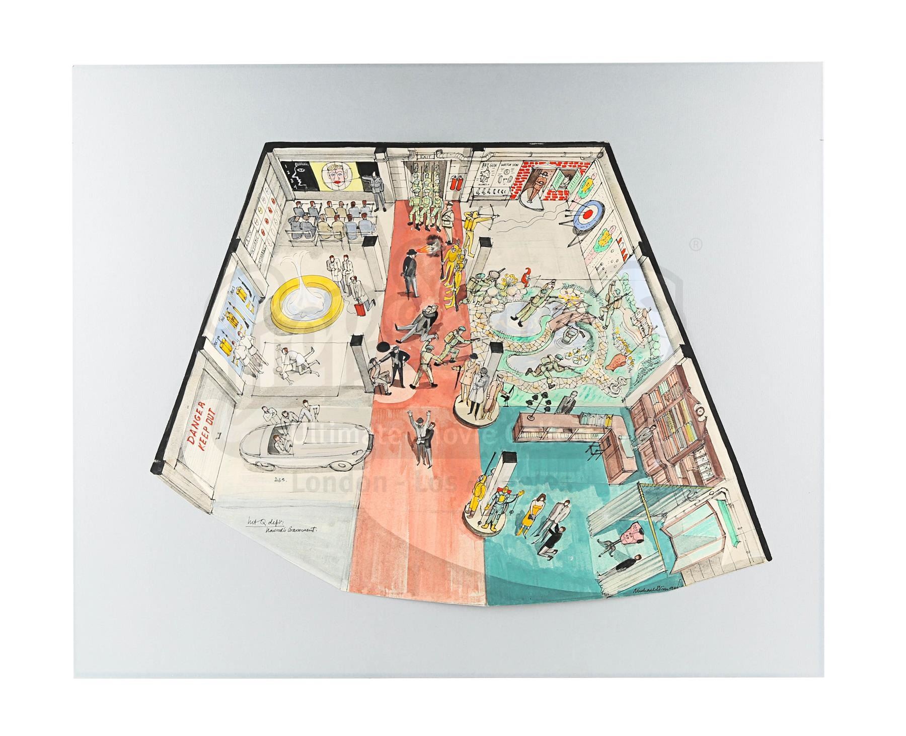 Hand-drawn artwork depicting two sets from Val Guest, Ken Hughes, John Huston, Joseph McGrath and Robert Parrish's Bond spoof Casino Royale. Titled "Int Q Dept: Harrod's Basement", one illustration depicts Evelyn Tremble's (Peter Sellers) visit to Q's (Geoffrey Bayldon) cellar, which was full of ineffective inventions. The second design, titled "The Goldfinger Room", shows a hidden room within the Casino Royale, where several women were painted gold.