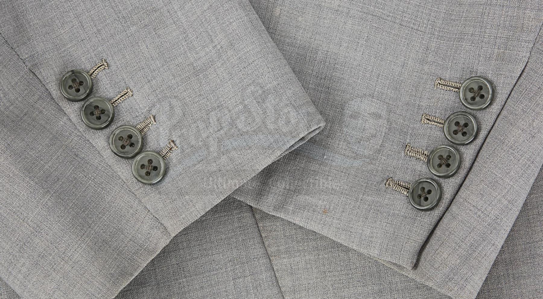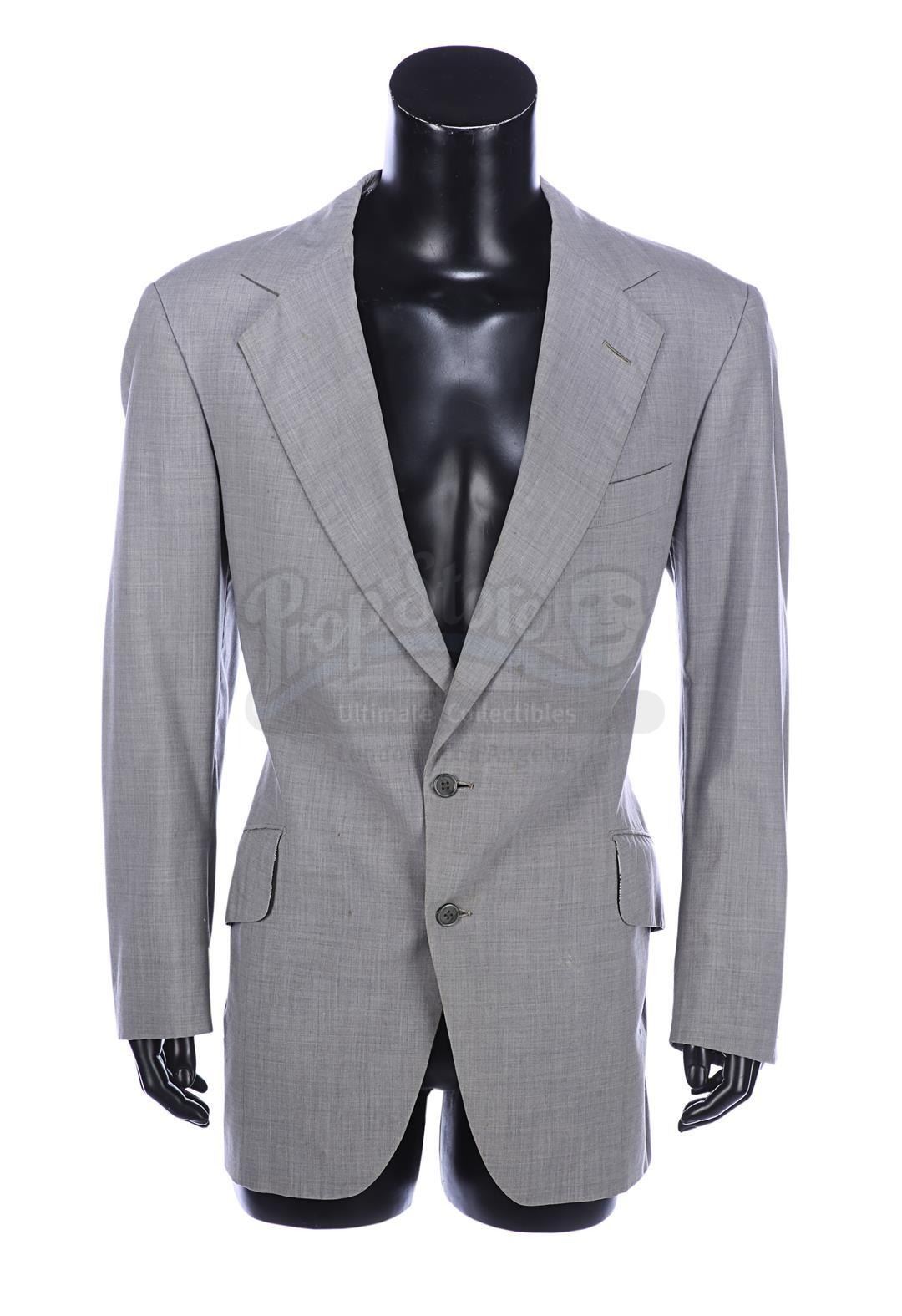 This suit jacket was custom-made by tailor Anthony Sinclair, who created clothing for all Sean Connery's appearances as 007. The single-breasted suit jacket is made from light grey worsted wool which features a subtle crosshatch pattern. The garment is lined with a black silk-like fabric decorated with an intricate printed white paisley-inspired pattern. Two slant pockets with wide flaps are situated at the hip and the left breast displays a welt pocket. Four small grey buttons are sewn to each cuff, and two larger matching buttons are attached to the front. The jacket displays light wear and minor brown-coloured marks on the front.