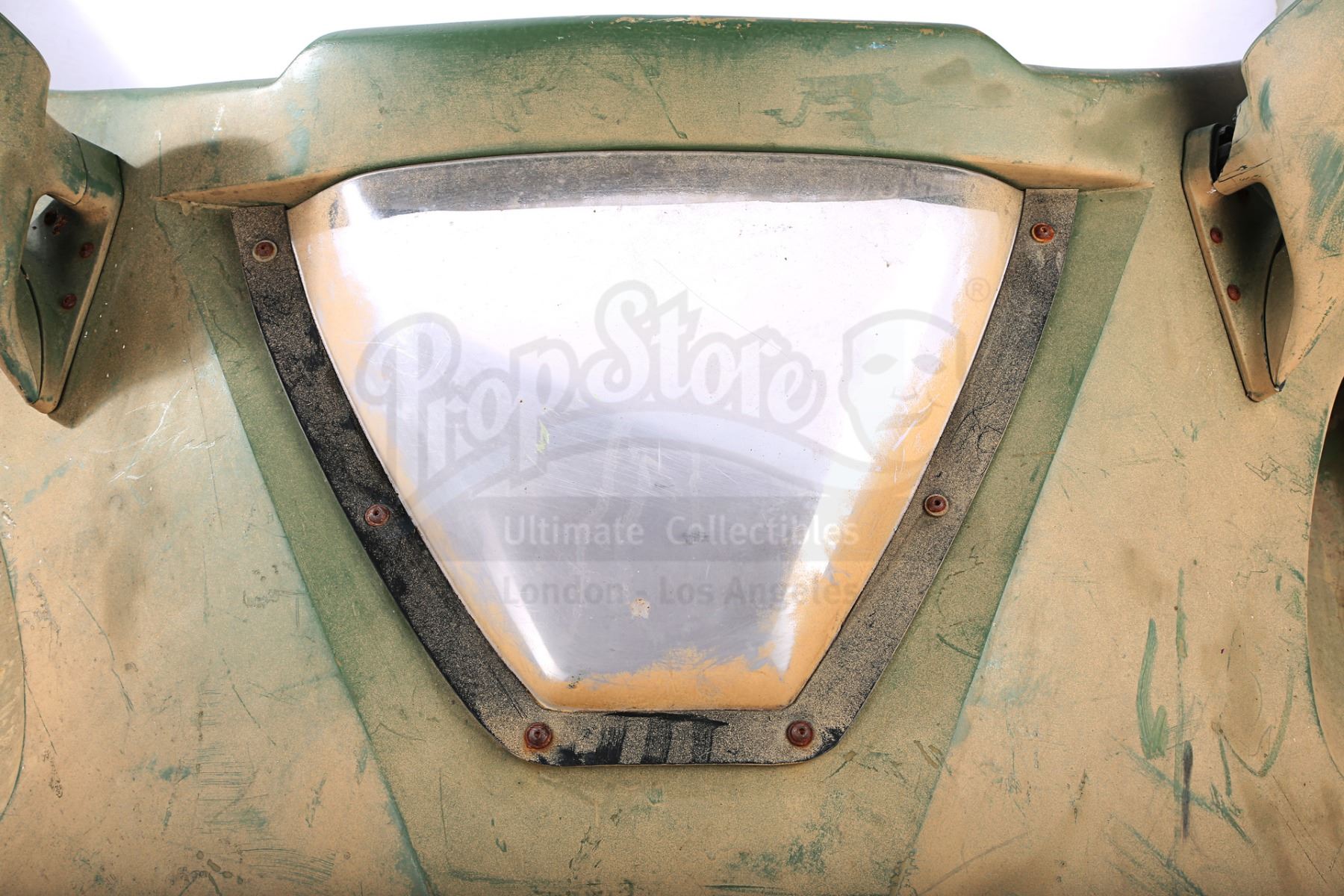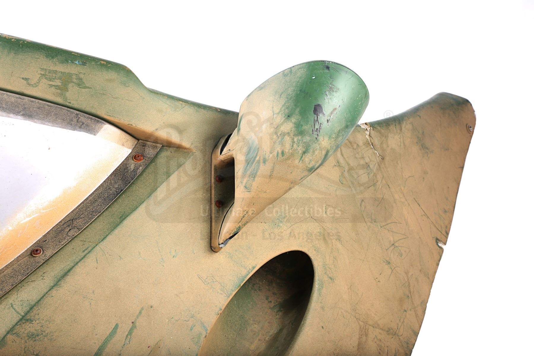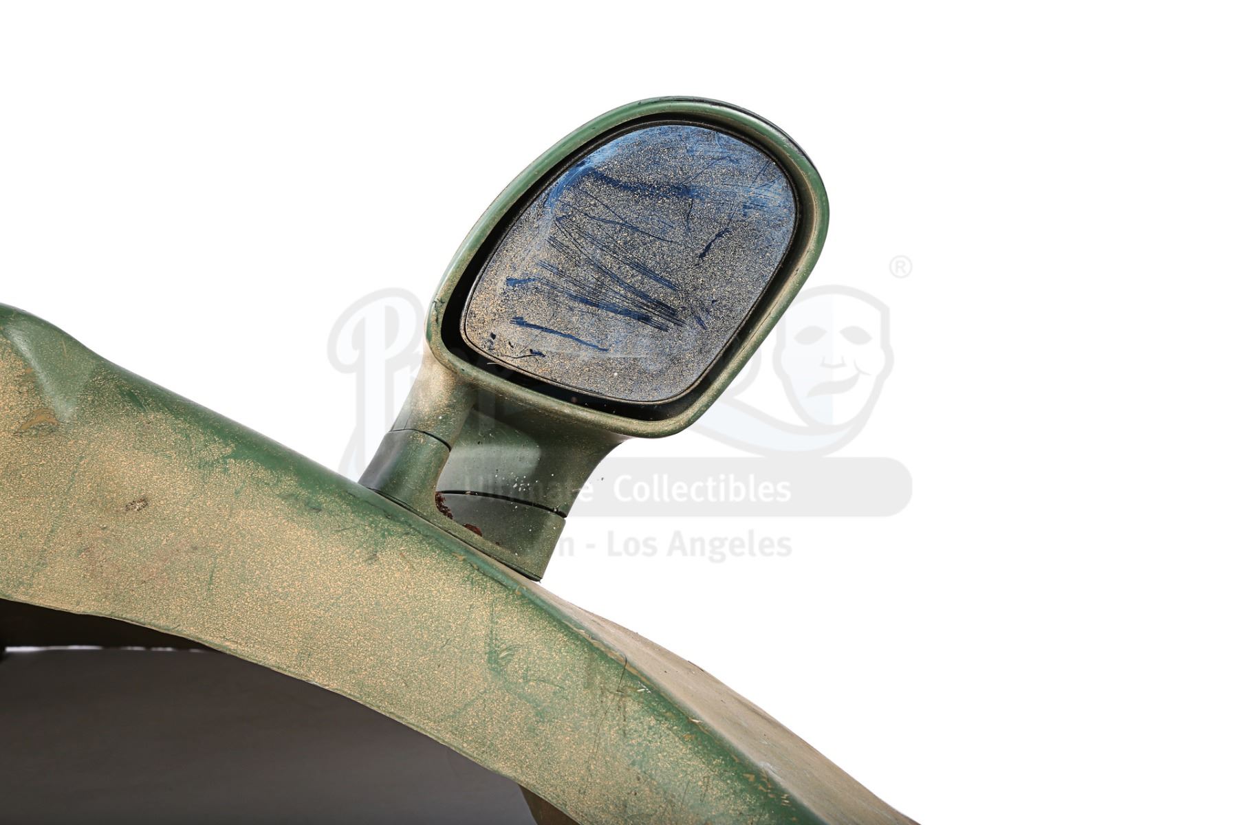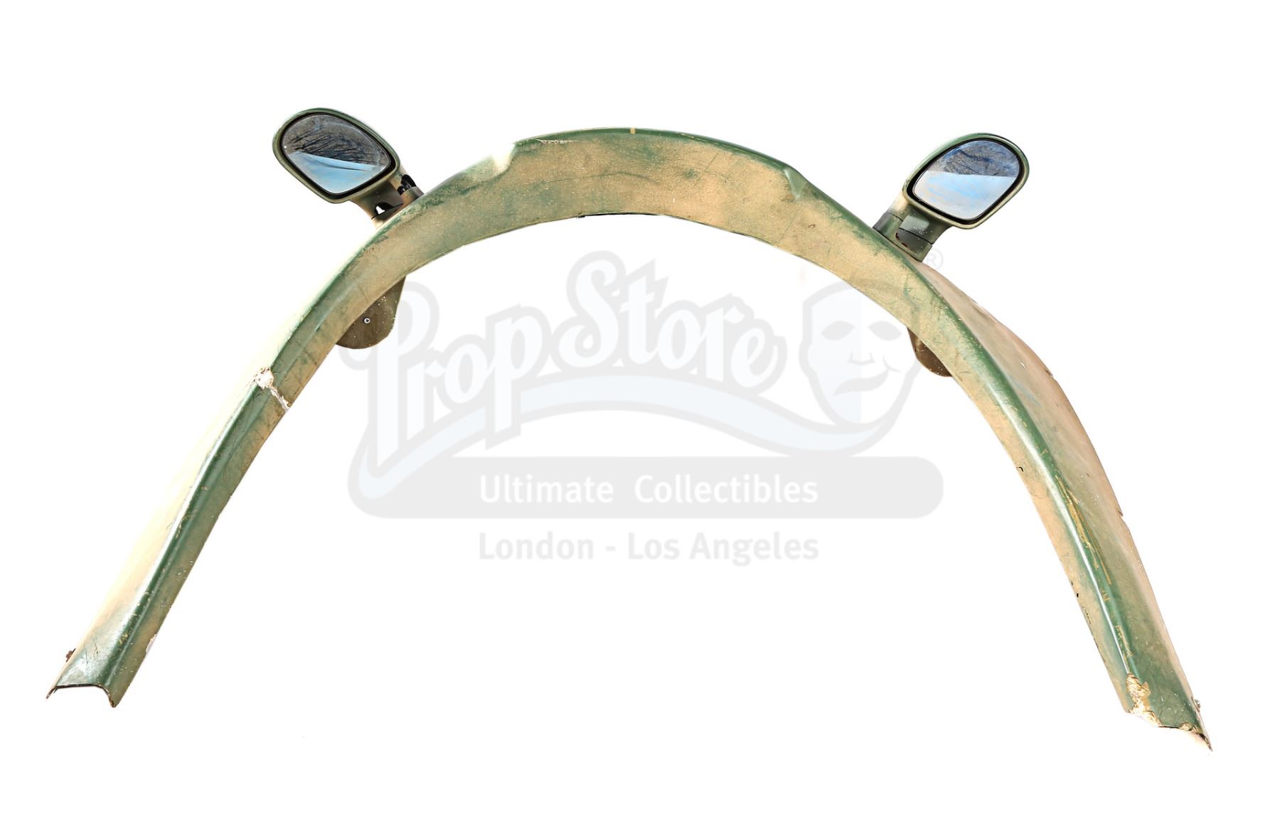The cone is green and made of fibreglass, with a clear plastic section at the front for the vehicle's light and two wing mirrors. There is a section on each side where a faux machine gun was mounted during production. The cone is intentionally distressed and painted to look dusty and scratched. The paintwork displays additional scratches and stains in places, and there are chips to the edges of the fibreglass. Dimensions: 130 cm x 128 cm x 43 cm (51 1/4" x 50 1/2" x 17")