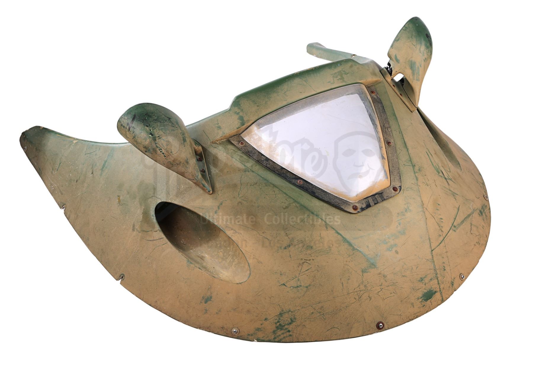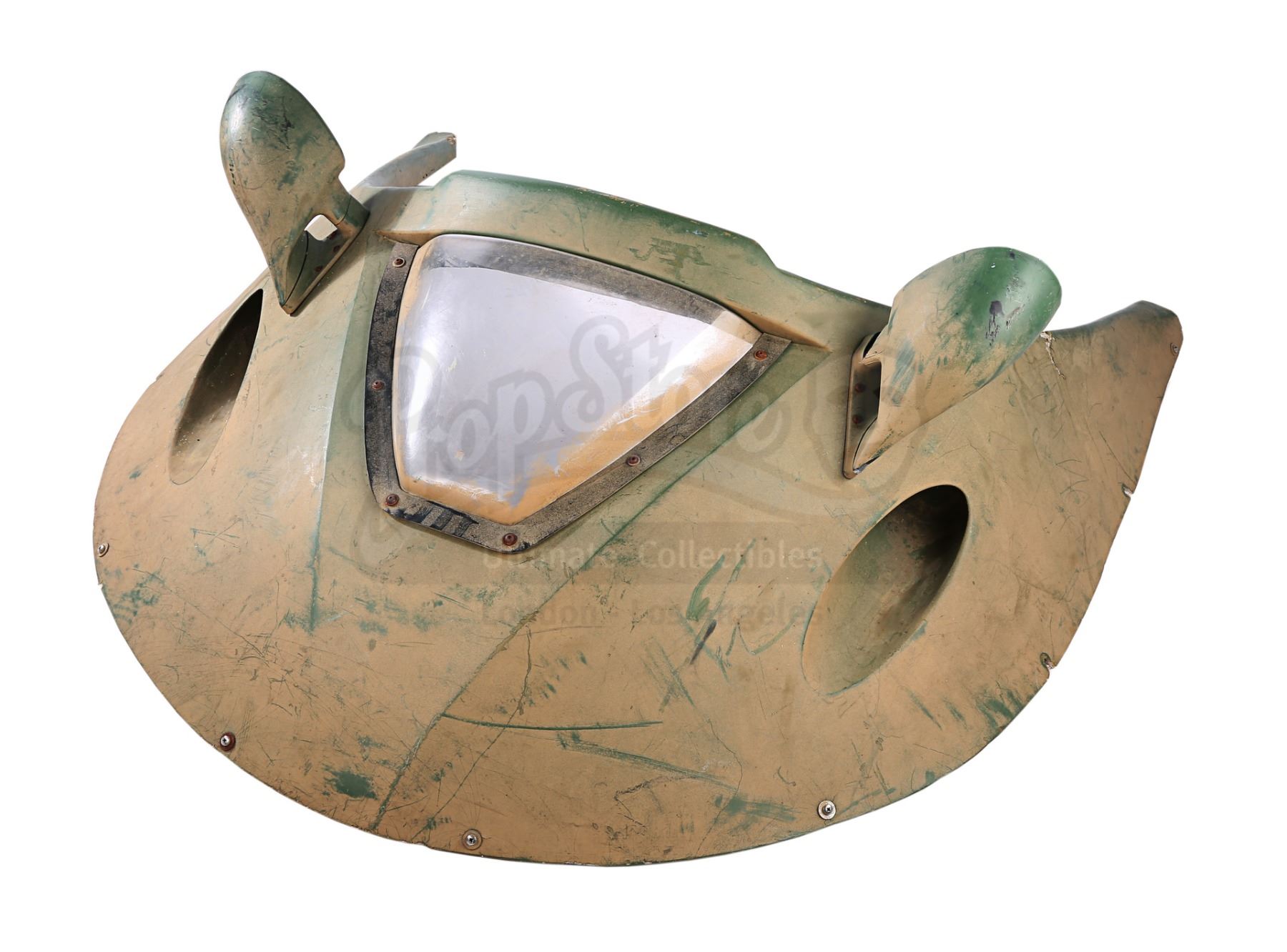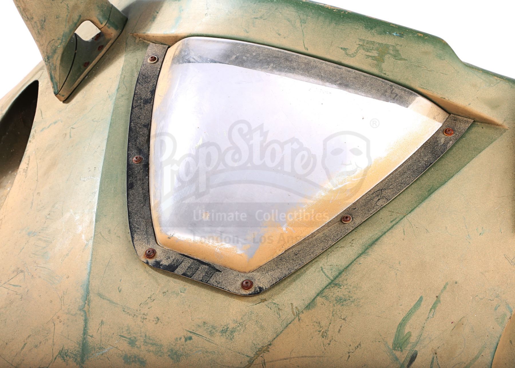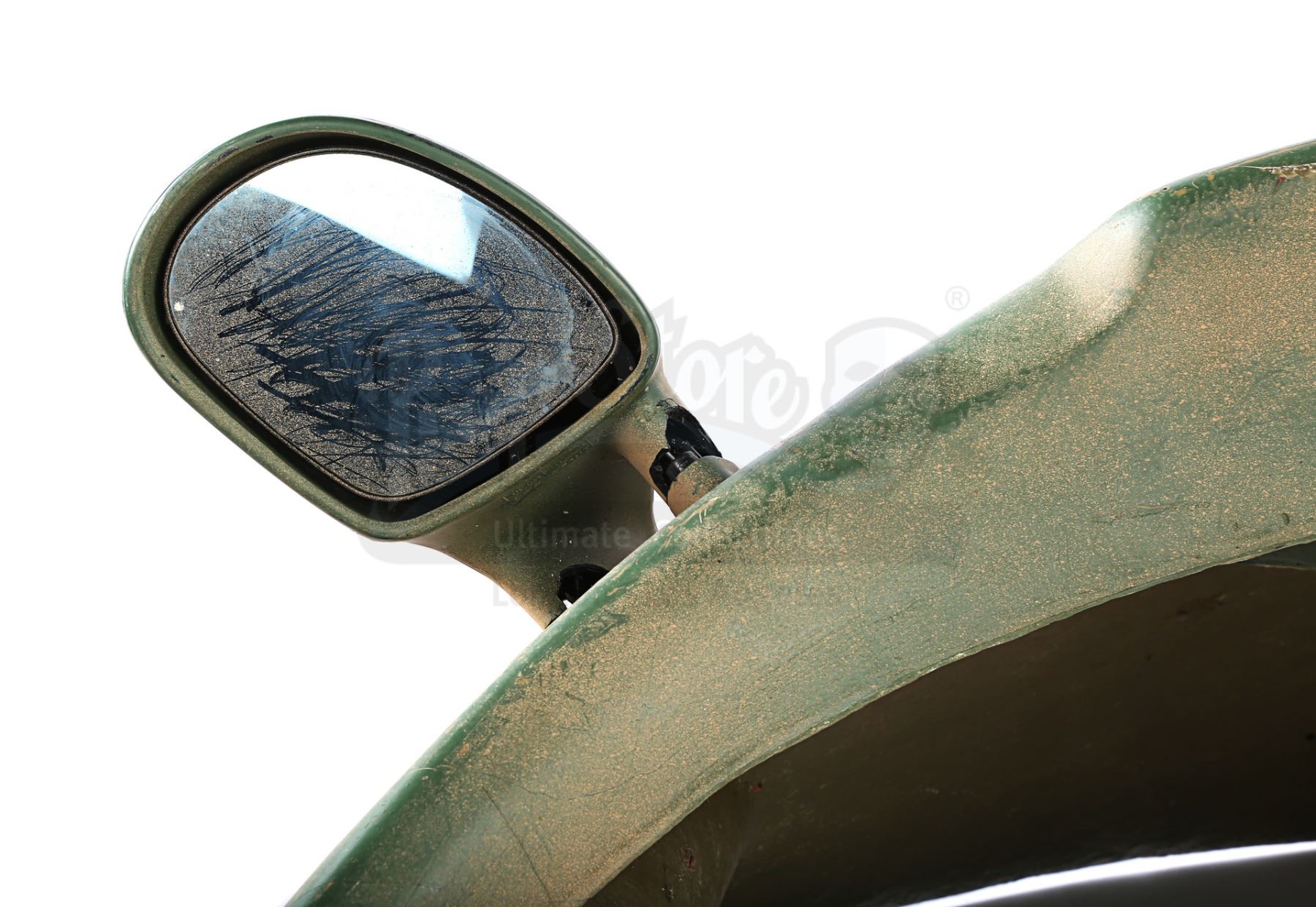 The cone is green and made of fibreglass, with a clear plastic section at the front for the vehicle's light and two wing mirrors. There is a section on each side where a faux machine gun was mounted during production. The cone is intentionally distressed and painted to look dusty and scratched. The paintwork displays additional scratches and stains in places, and there are chips to the edges of the fibreglass. Dimensions: 130 cm x 128 cm x 43 cm (51 1/4" x 50 1/2" x 17")