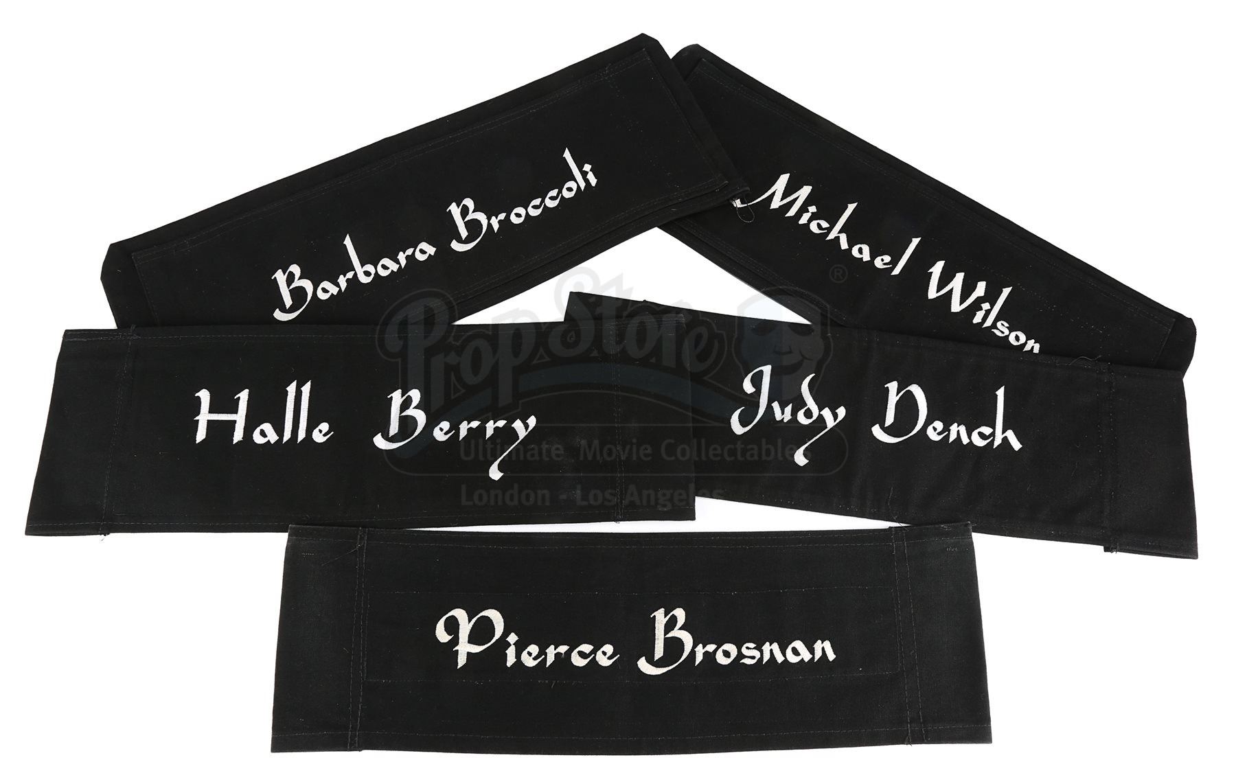 The lot comprises five chairbacks featuring the names of Pierce Brosnan, Halle Berry, Judy Dench and producers Barbara Broccoli and Michael G. Wilson. Made of black canvas fabric, the five chairbacks display various visible lines of stitching and the names embroidered in white. The set displays marks, loose threads, discolouration on some of the embroidered names and minor wear from production use. Dimensions (cast members): 18 cm x 57 cm x 0.2 cm (7 ¼” x 22 ½” x ¼”); (crew members): 21 cm x 57.5 cm x 0.5 cm (8 ¼” x 22 ¾” x ¼”)