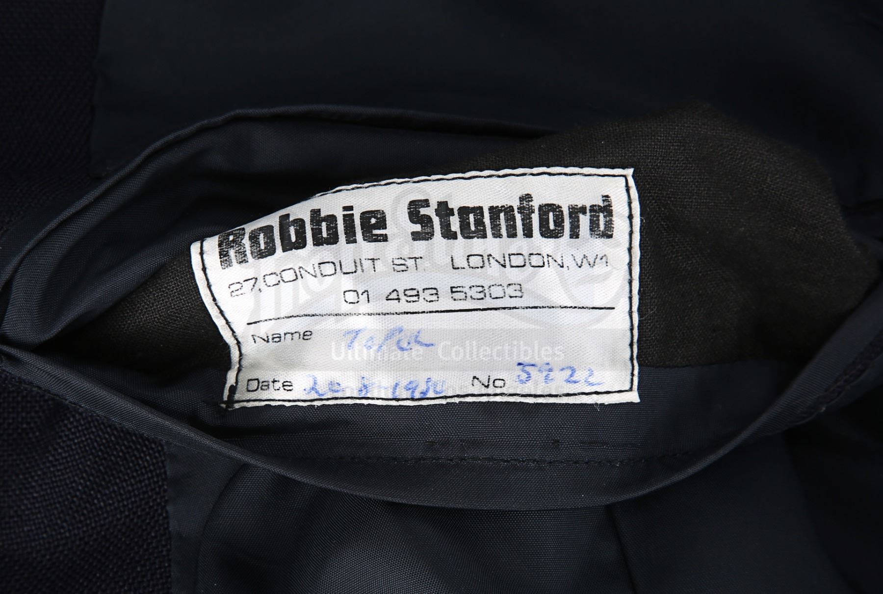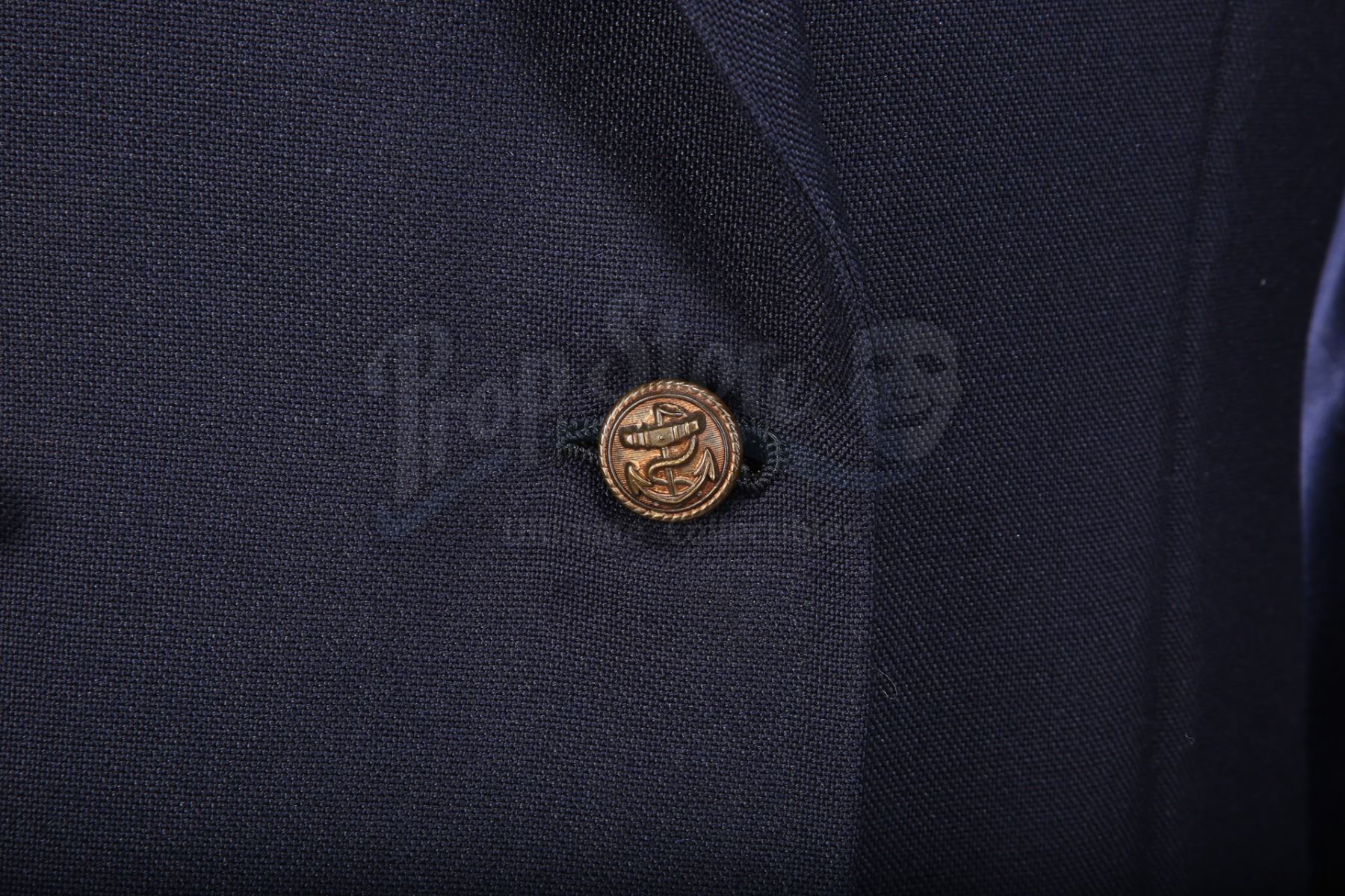 The navy woollen blazer is double breasted, with brass buttons featuring an anchor motif. It has three patch pockets and two inside pockets, one of which features a label for tailor Robbie Stanford, reading "Topol, 20-8-1980, 5922", handwritten in blue pen. The lot is accompanied by a colour still of Columbo wearing his blazer and a letter of authenticity from the film's wardrobe master Tiny Nicholls. The jacket has some very minor staining from age and production use.