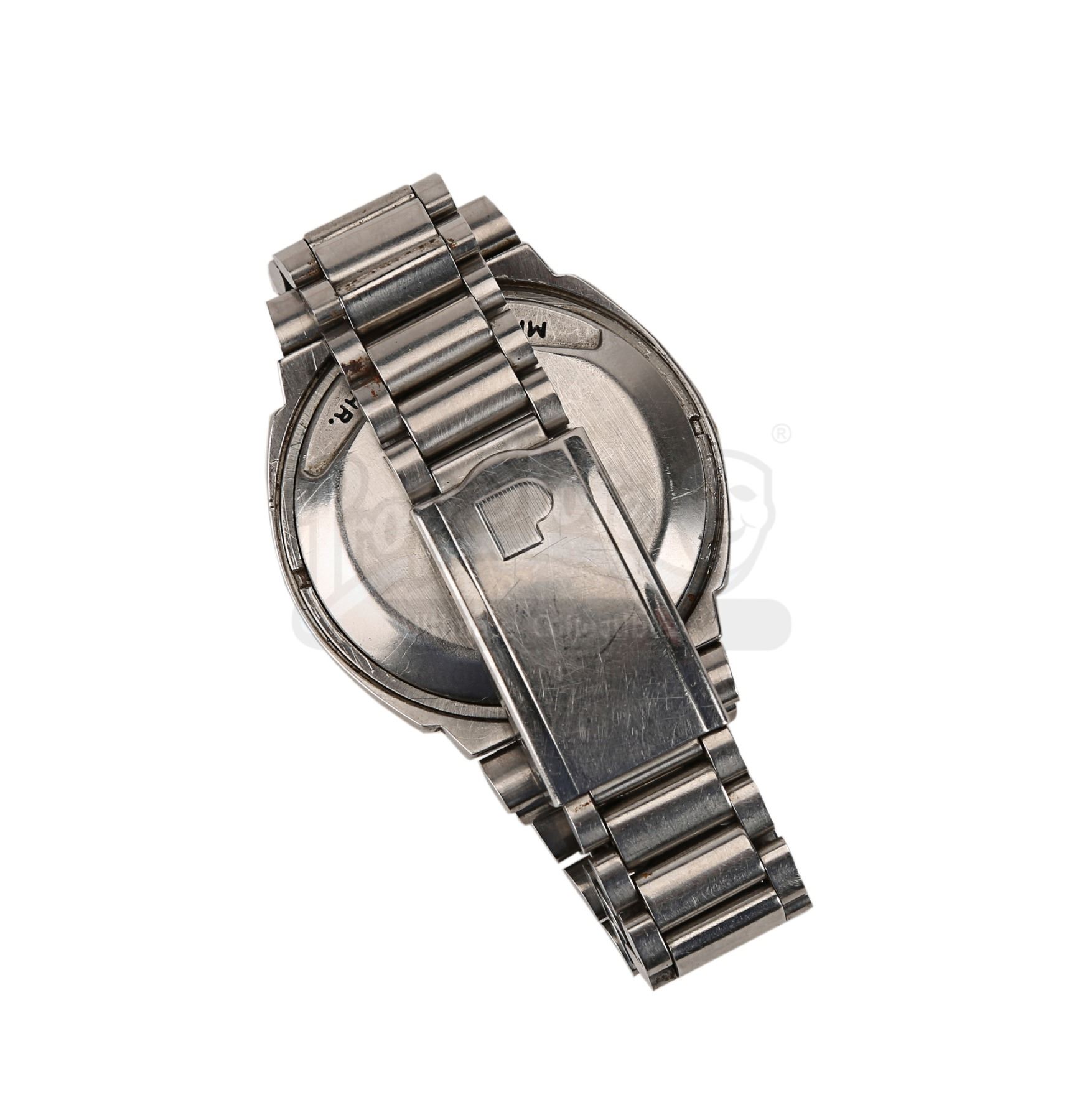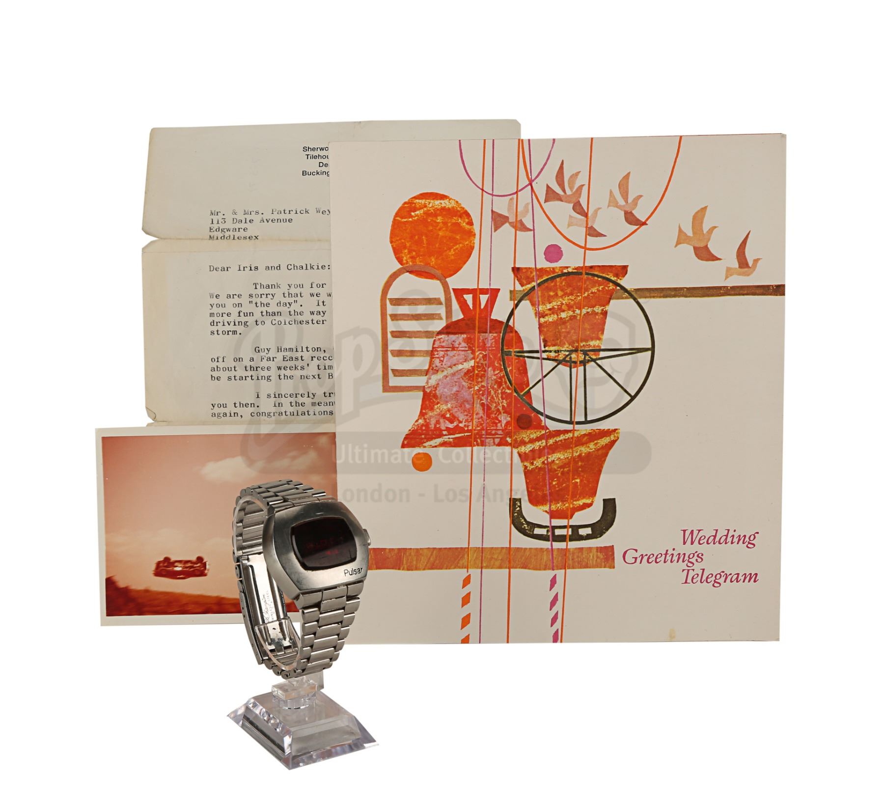 The lot also includes a photograph taken on set, and a wedding telegram and letter addressed to Patrick Weymouth from Roger Moore. Several minor scratches are present on the metal bezel and the display screen of the watch which also exhibits minor signs of corrosion. The letter displays general wear, multiple fold lines from storage and slight discolouration. The new custodian of this lot will receive a letter of authenticity from a member of Weymouth's family. Dimensions (watch): 9 cm x 4 cm x 2 cm (3 1/2" x 1 1/2" x 3/4"); (letter): 22.5 cm x 17.5 cm (9" x 7"); (telegram): 21 cm x 18.5 cm (8 1/4" x 7 1/4"); (photo): 9 cm x 11 cm (3 1/2" x 4 1/4")
