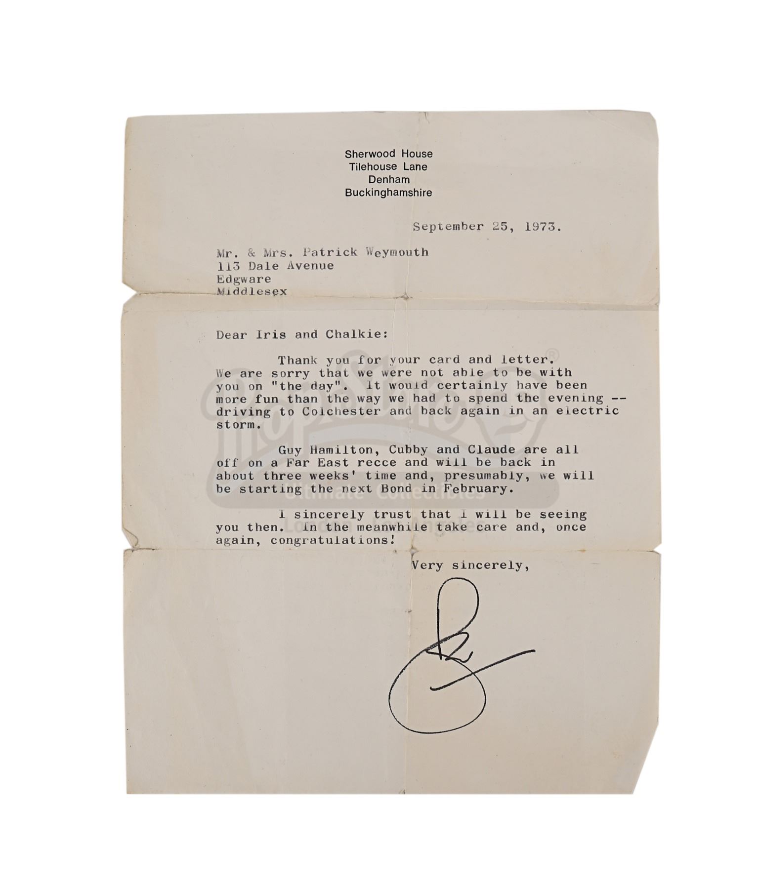 James Bond's (Roger Moore) Hamilton Pulsar watch, an on-set photograph, a wedding telegram and a letter from the production of Guy Hamilton's Bond movie Live and Let Die. This lot was obtained from the collection of the production's prop master Patrick Weymouth, who became close friends with Roger Moore.