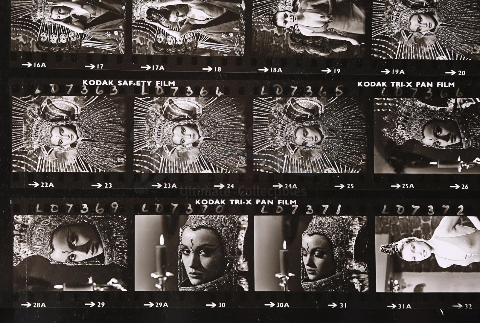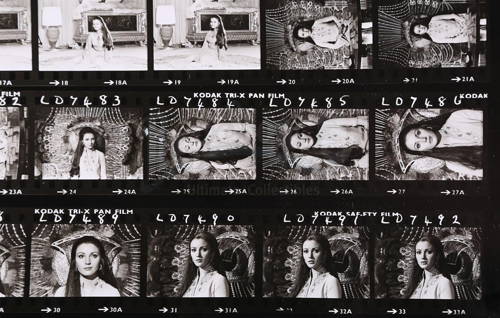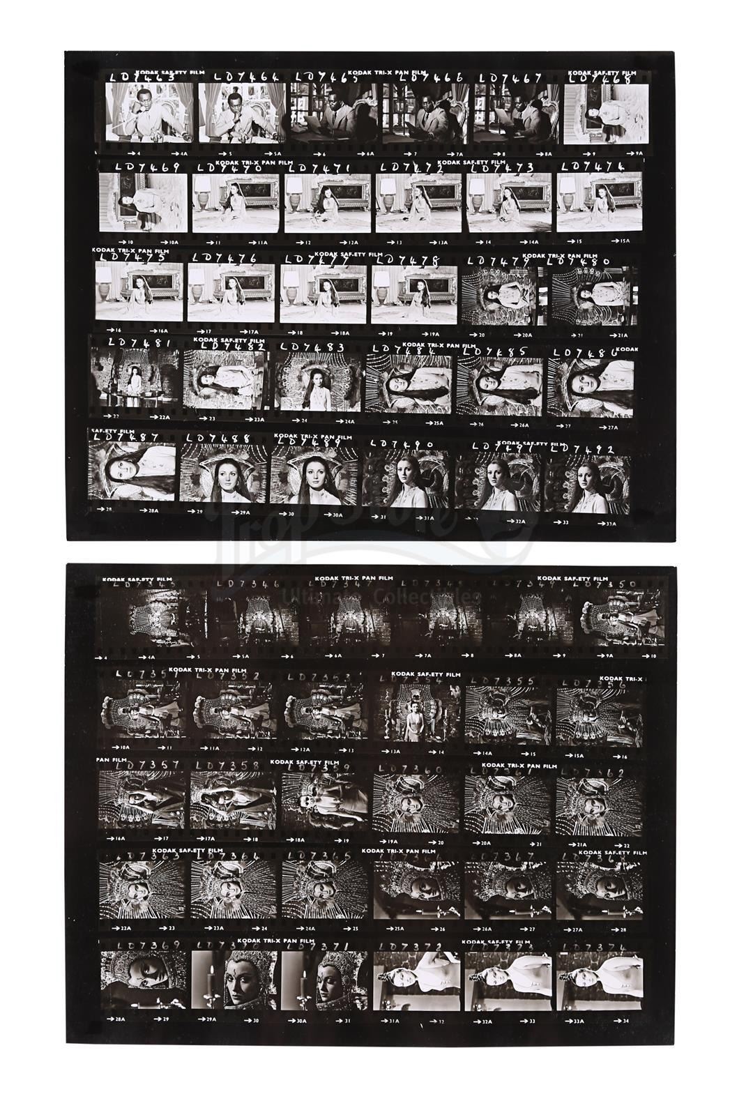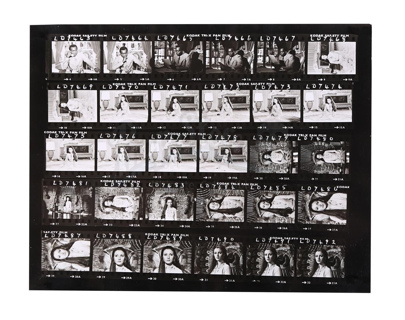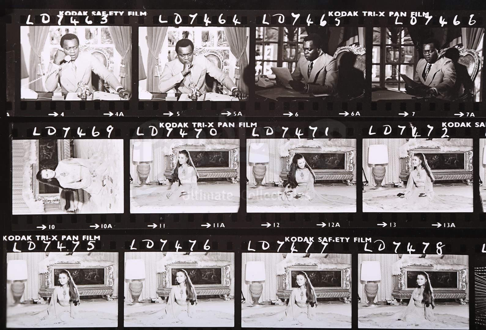 A pair of contact sheets from the production of Guy Hamilton's Bond movie Live and Let Die. Photographed on set, the majority of the images show Solitaire (Jane Seymour) sitting in her elaborate seat with her tarot cards in two different scenes, while five of the images feature Dr. Kananga (Yaphet Kotto) sat at his desk. Also included are 11 candid shots of Seymour posing on set. Printed on photographic paper, each Kodak sheet consists of 30 black-and-white images, all numbered between "LD7345" and "LD7492". The lot exhibits some bending from age and handling, and there is minor wear to the edges. Dimensions (each sheet): 20.5 cm x 25.5 cm (8" x 10")