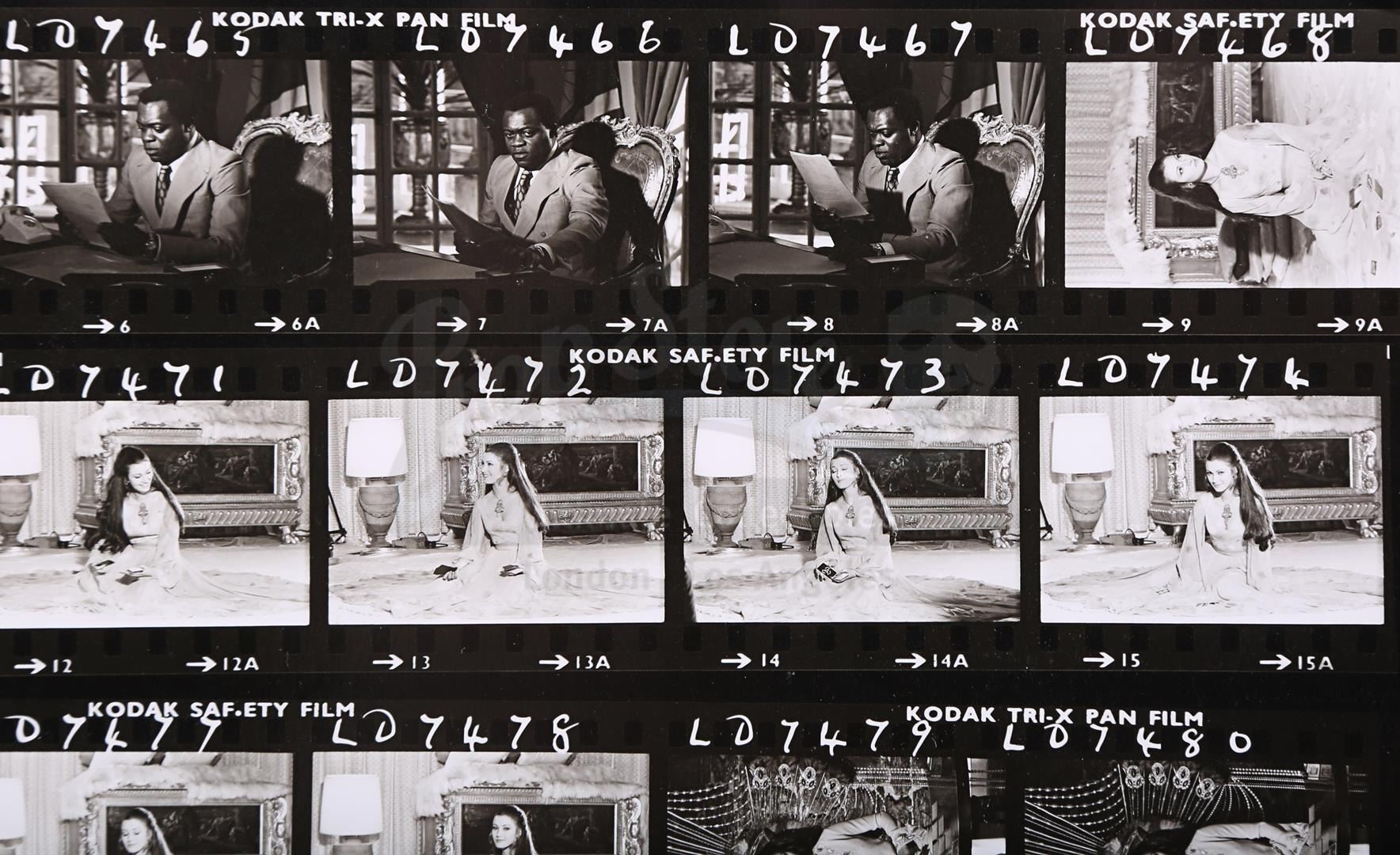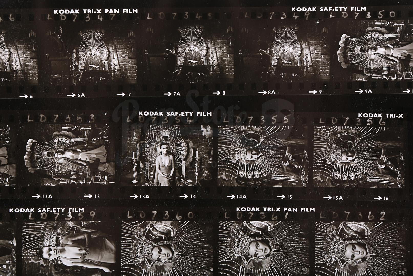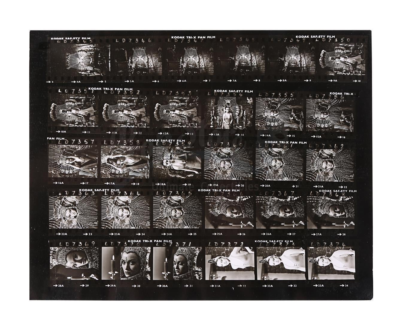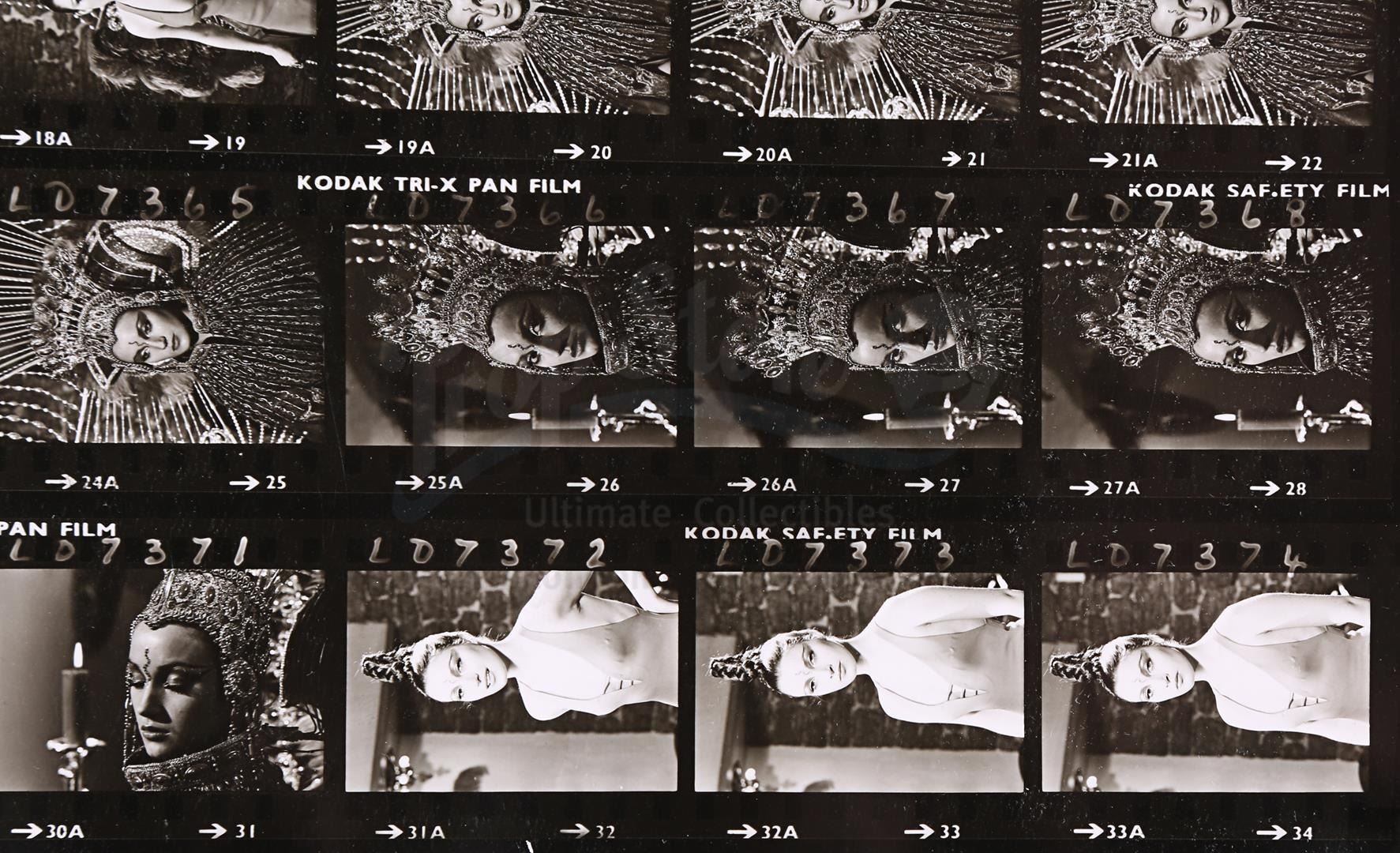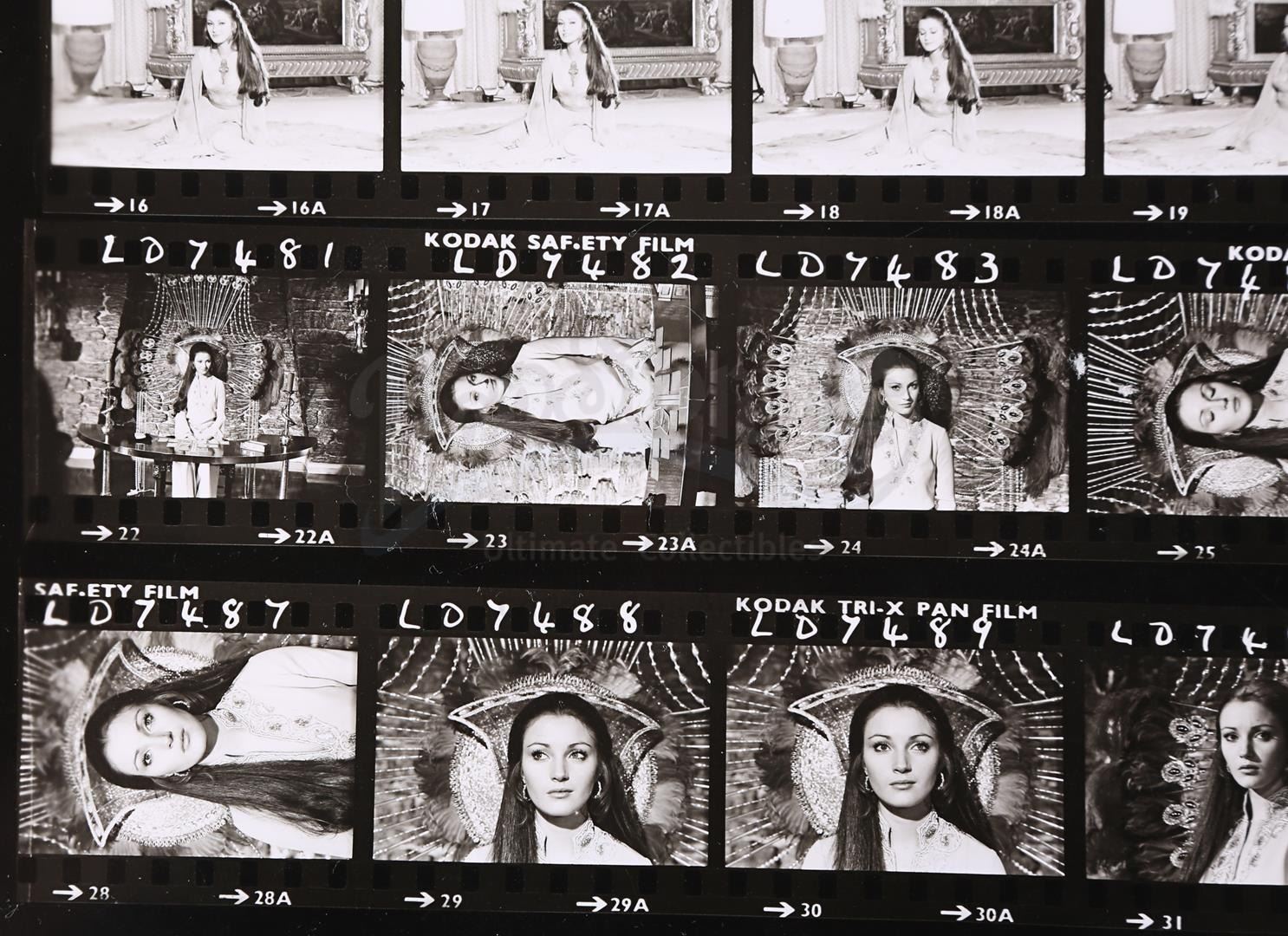 A pair of contact sheets from the production of Guy Hamilton's Bond movie Live and Let Die. Photographed on set, the majority of the images show Solitaire (Jane Seymour) sitting in her elaborate seat with her tarot cards in two different scenes, while five of the images feature Dr. Kananga (Yaphet Kotto) sat at his desk. Also included are 11 candid shots of Seymour posing on set. Printed on photographic paper, each Kodak sheet consists of 30 black-and-white images, all numbered between "LD7345" and "LD7492". The lot exhibits some bending from age and handling, and there is minor wear to the edges. Dimensions (each sheet): 20.5 cm x 25.5 cm (8" x 10")