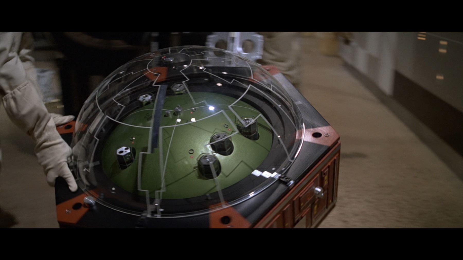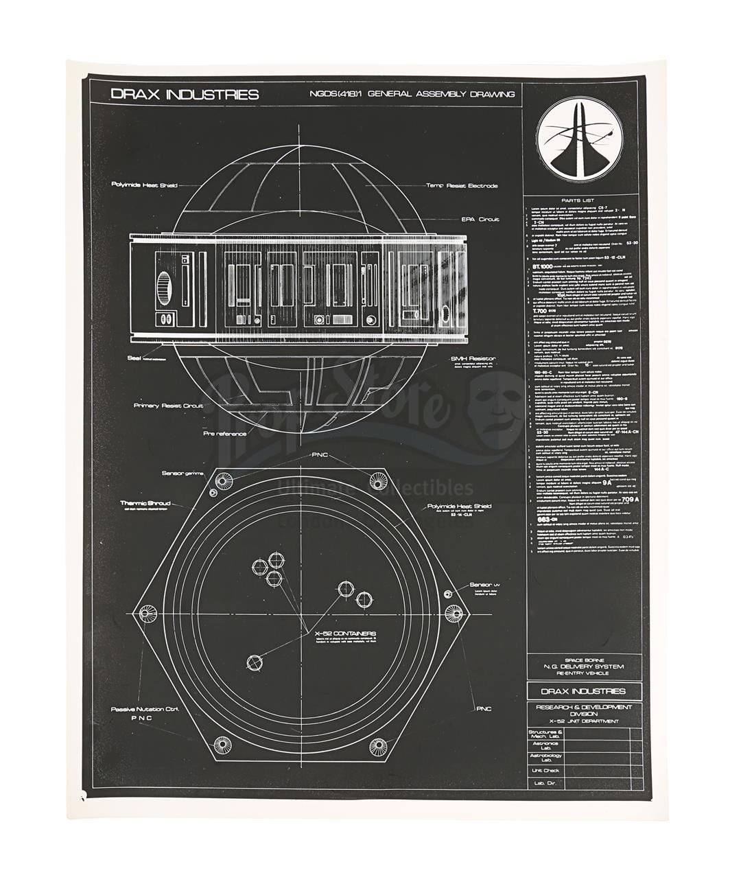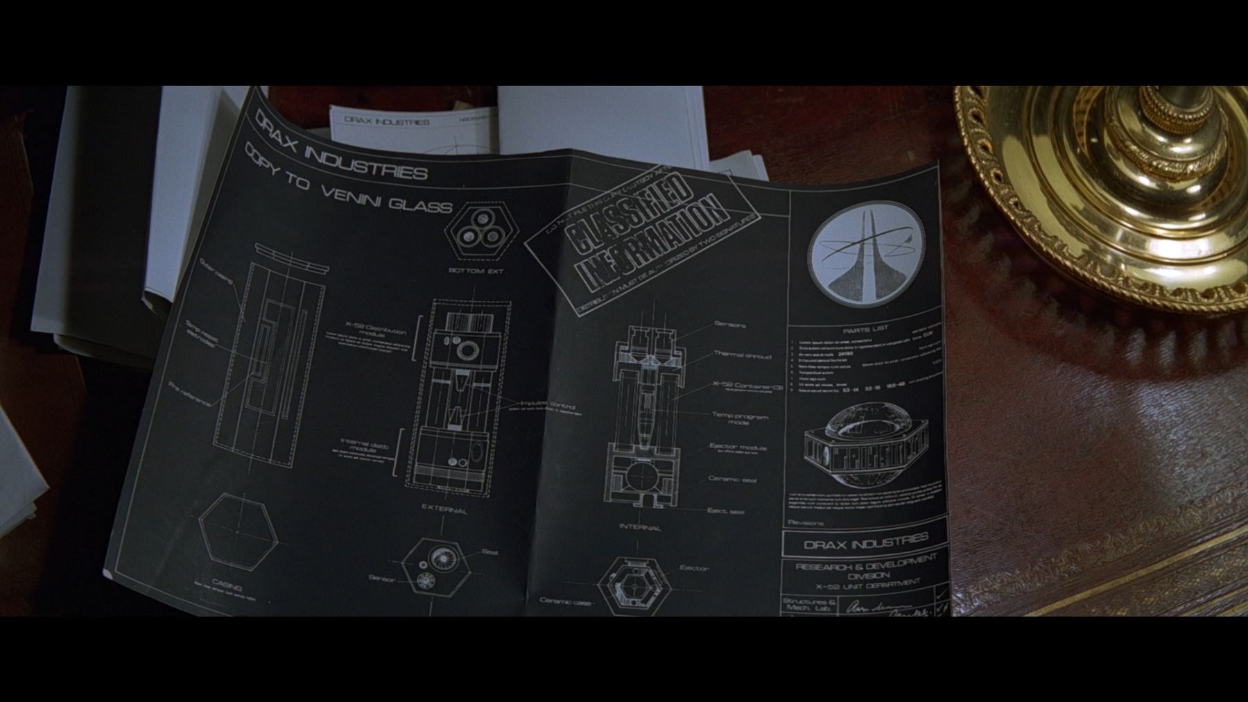 13 black-and-white stills feature the space station; 14 colour and black-and-white stills feature the models of Drax's (Michael Lonsdale) soldiers and the Marines in their spacesuits; five stills feature a Moonraker shuttle; and three more are copies of the plans for the toxin vial and toxin dispersal unit that lead Bond (Roger Moore) to Venice.