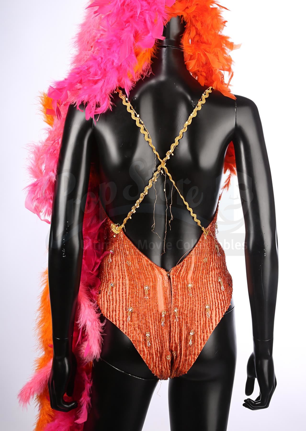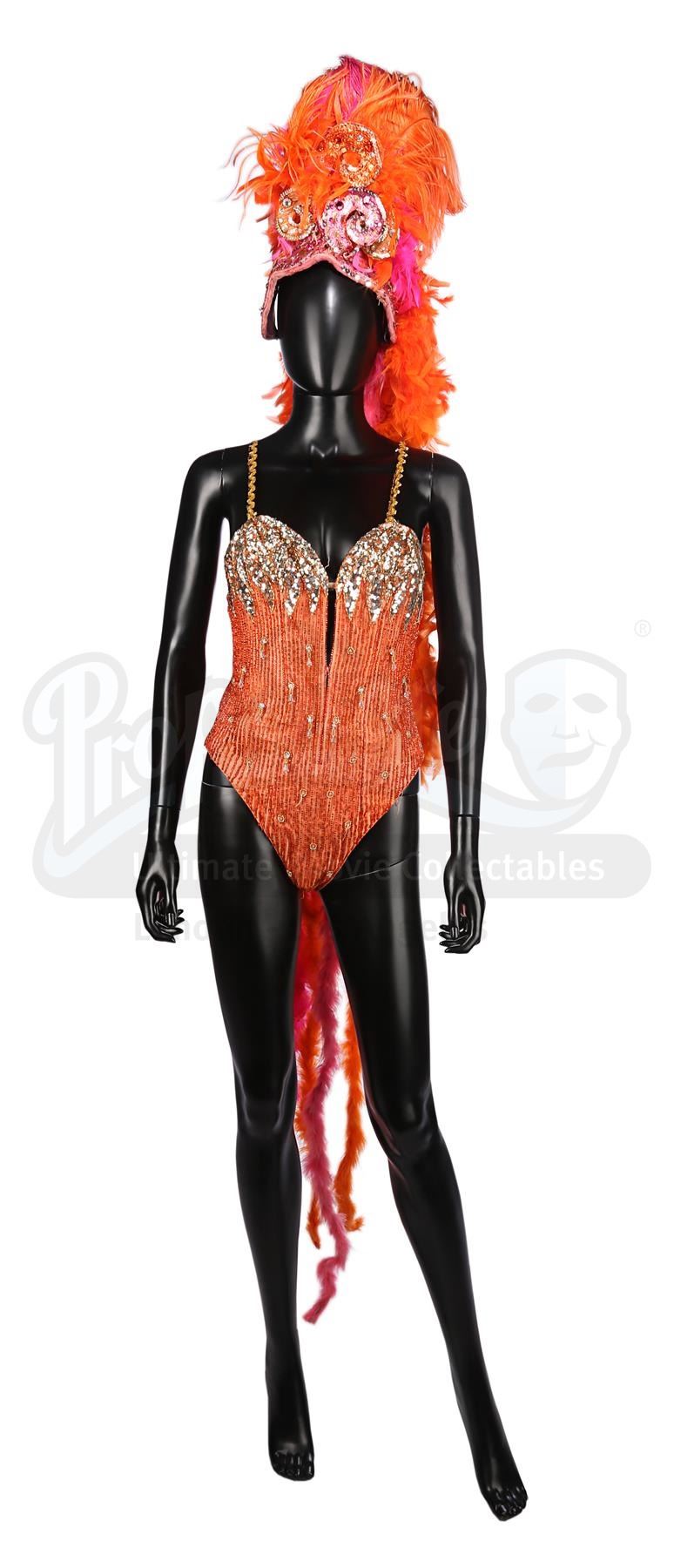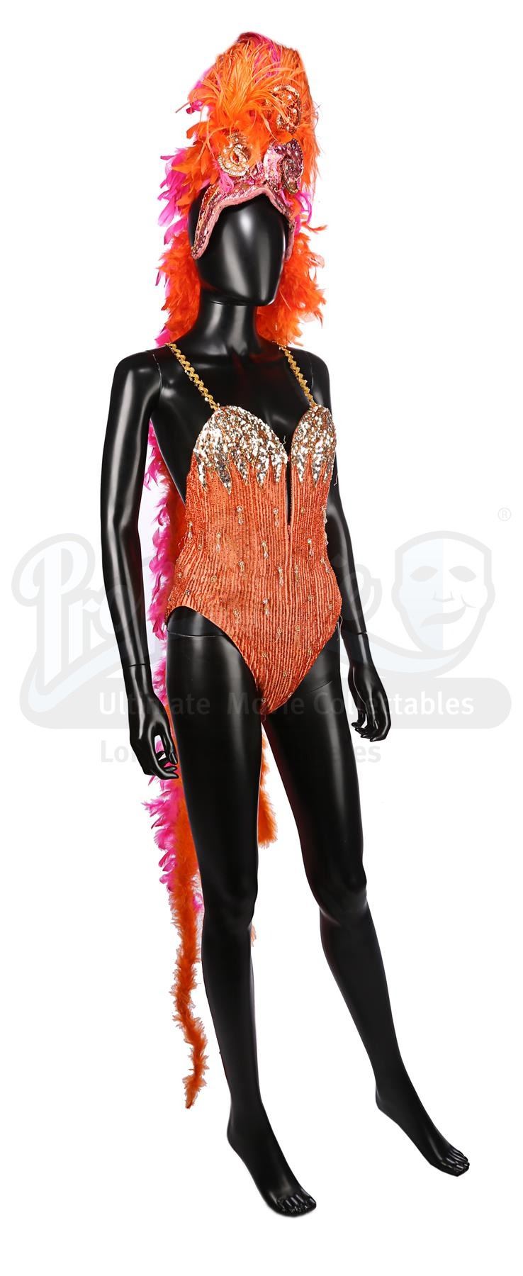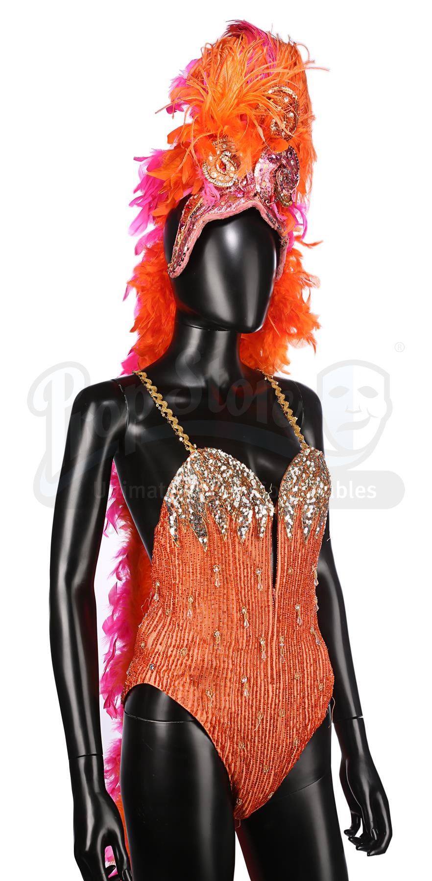 The costume features a heavily embellished sequined orange body with a corseted back that is done up with hook-and-eye fastening. It also features an ornate headdress decorated with sequins and feathers, so long they almost reach the ground. Inside the body there is a label for "Janine Andrews", credited as one of the "Octopussy Girls". No sizes are labelled. There is minor wear from age, storage and use on production, including a few missing sequins and some areas where the fabric has plucked.