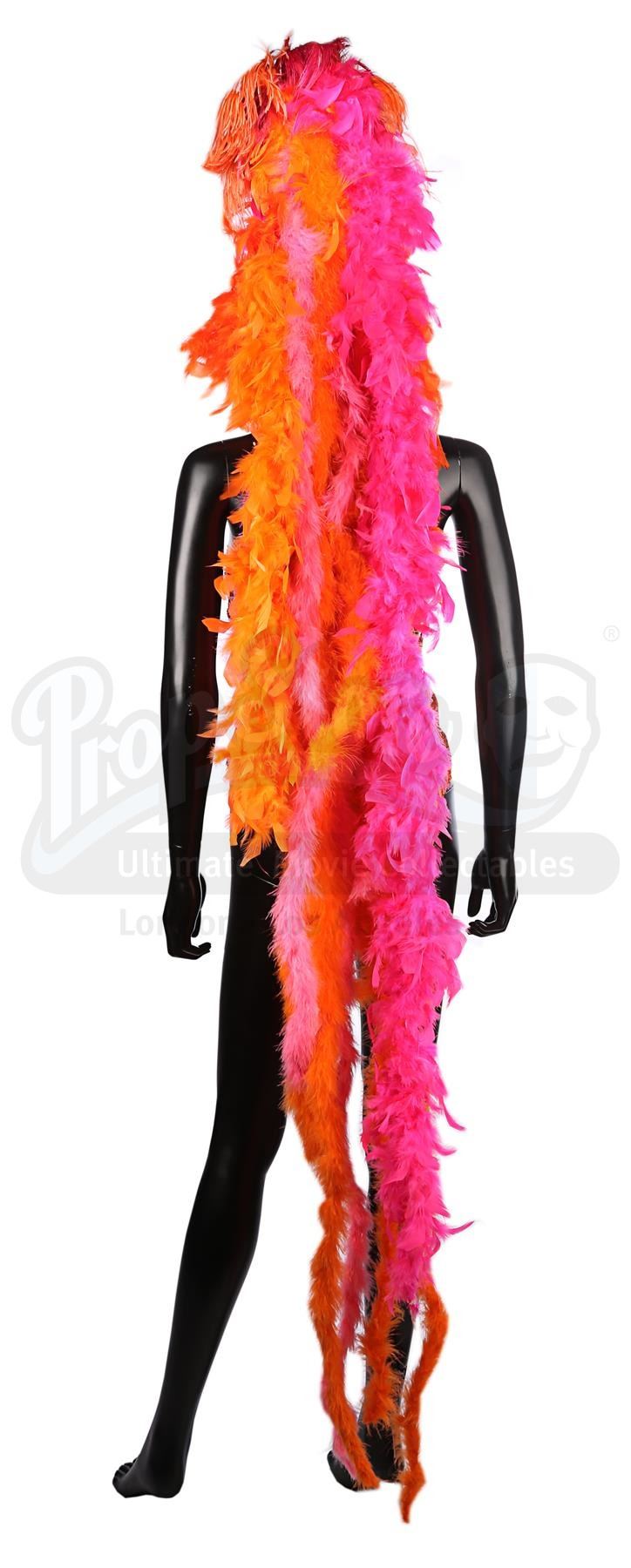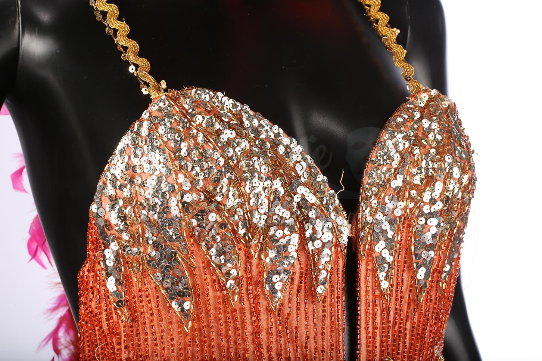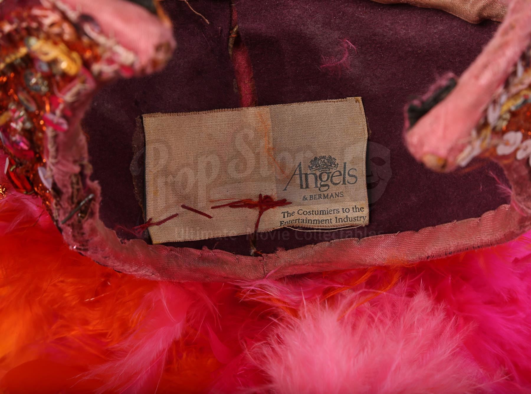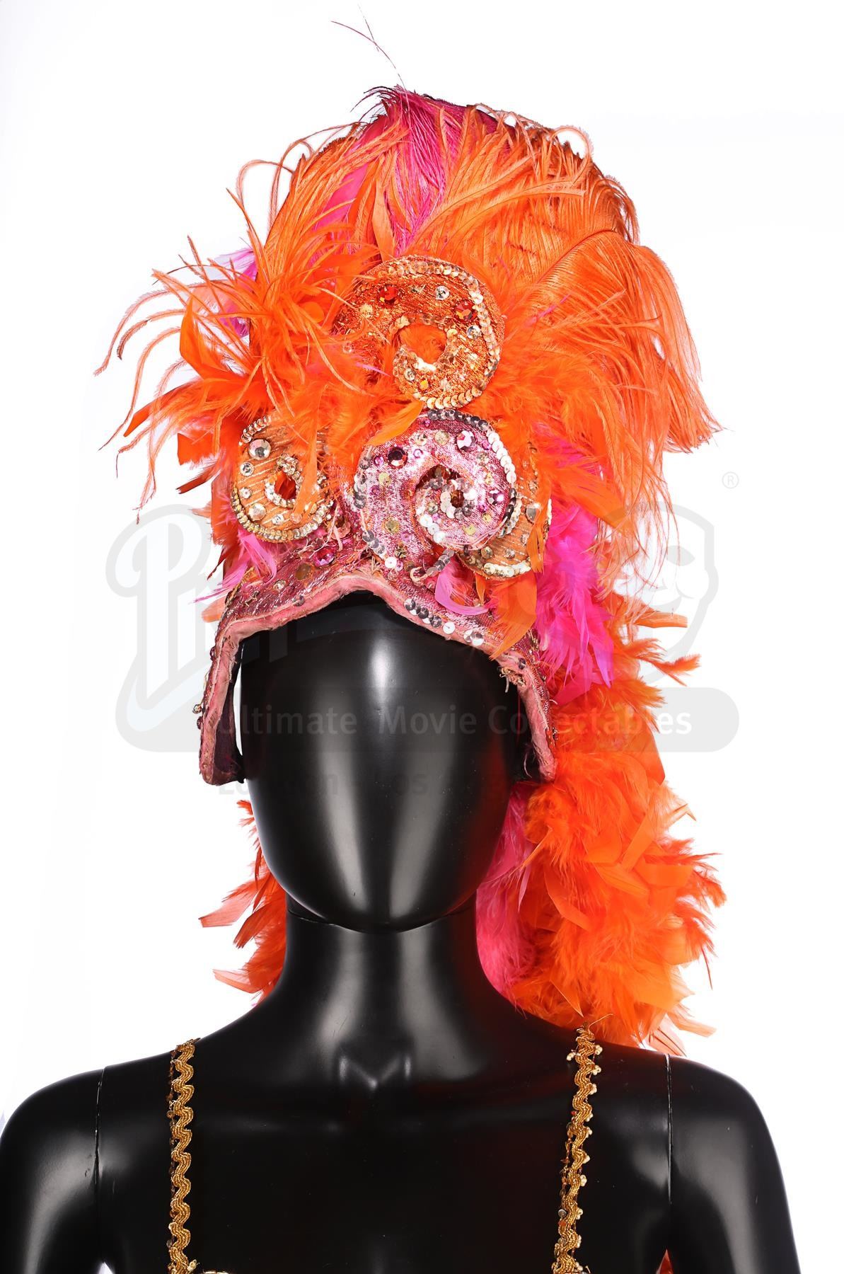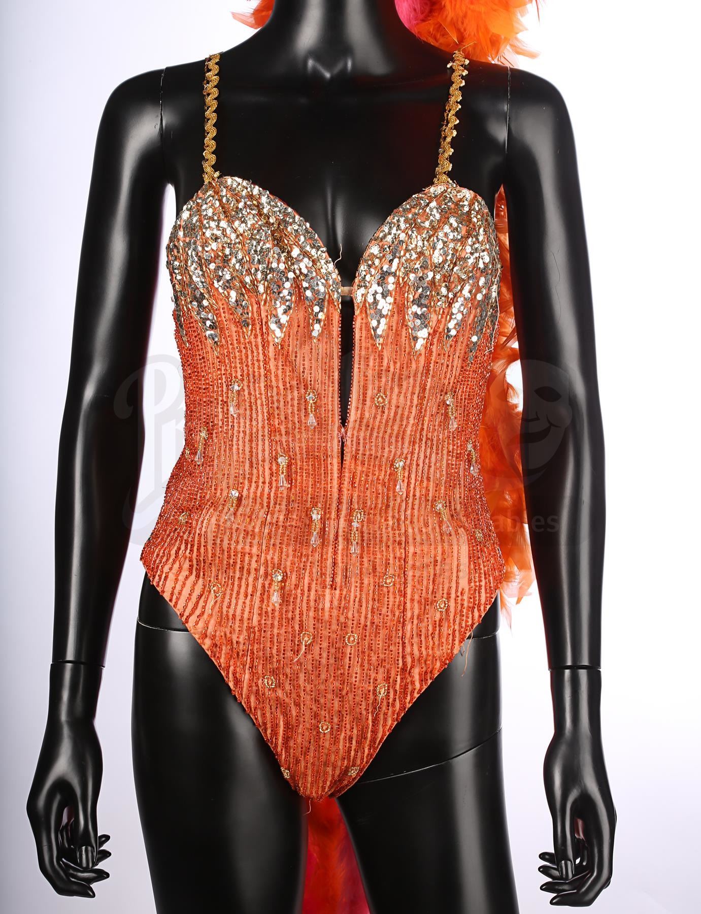 The costume features a heavily embellished sequined orange body with a corseted back that is done up with hook-and-eye fastening. It also features an ornate headdress decorated with sequins and feathers, so long they almost reach the ground. Inside the body there is a label for "Janine Andrews", credited as one of the "Octopussy Girls". No sizes are labelled. There is minor wear from age, storage and use on production, including a few missing sequins and some areas where the fabric has plucked.