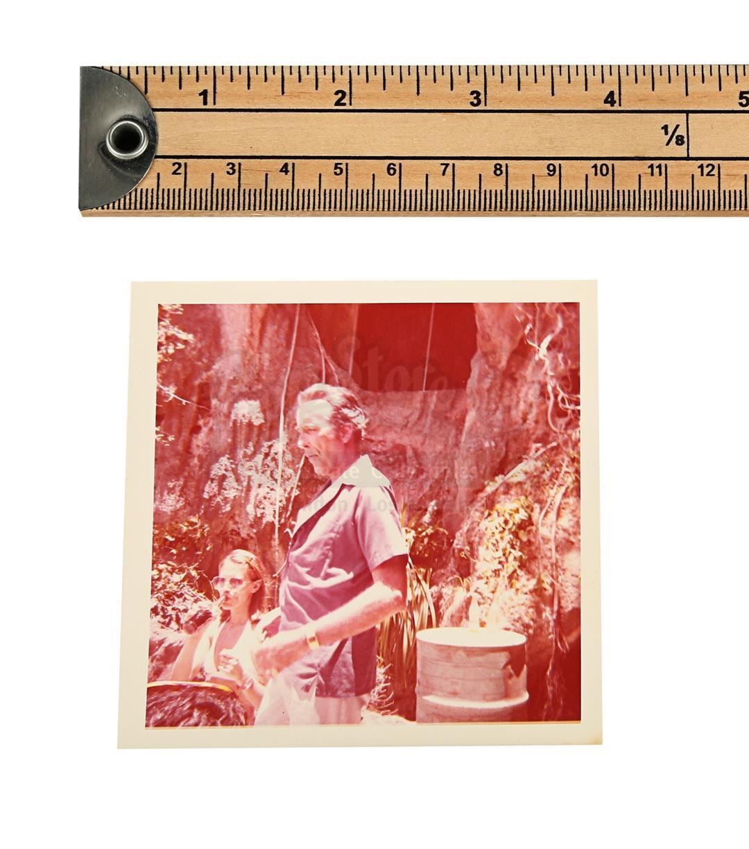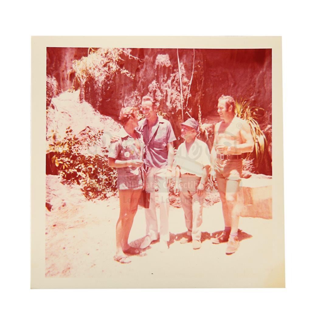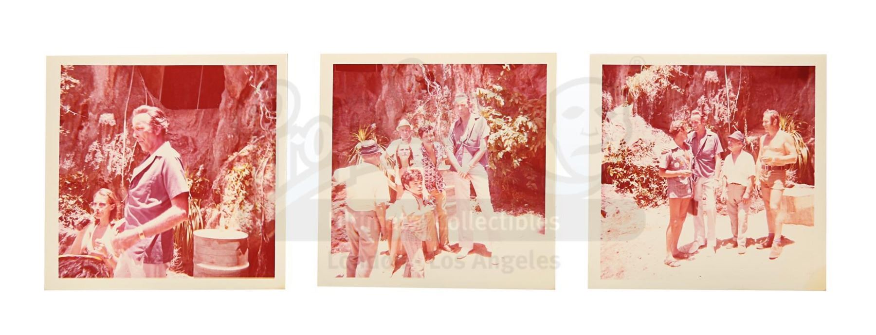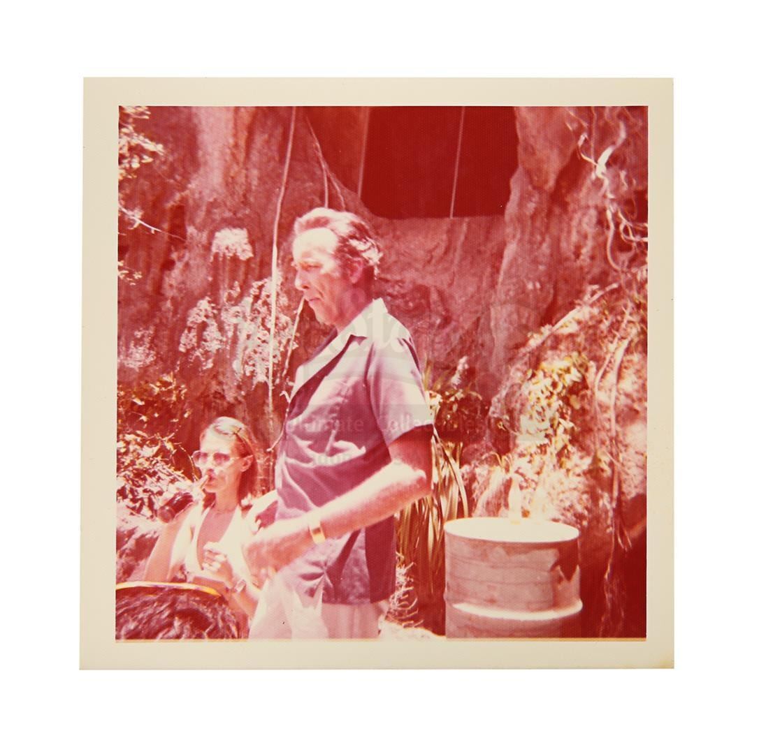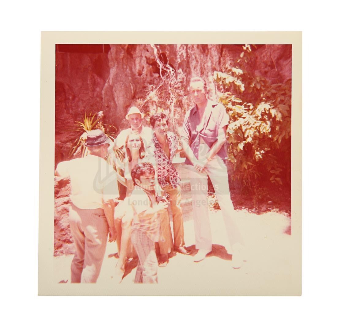 Three on-set photographs featuring Christopher Lee from the production of Guy Hamilton's Bond movie The Man With The Golden Gun. Obtained from the collection of the production's prop master Patrick Weymouth, the three colour images show Christopher Lee, who played the villainous assassin Scaramanga, standing and chatting with various crew members between takes while filming in Thailand. One of the photos features Hervé Villechaize, who played Scaramanga's assistant Nick Nack. All of the photos exhibit slight discolouration around the edges, but display minimal wear. Dimensions (each photo): 9 cm x 9 cm (3 1/2" x 3 1/2")