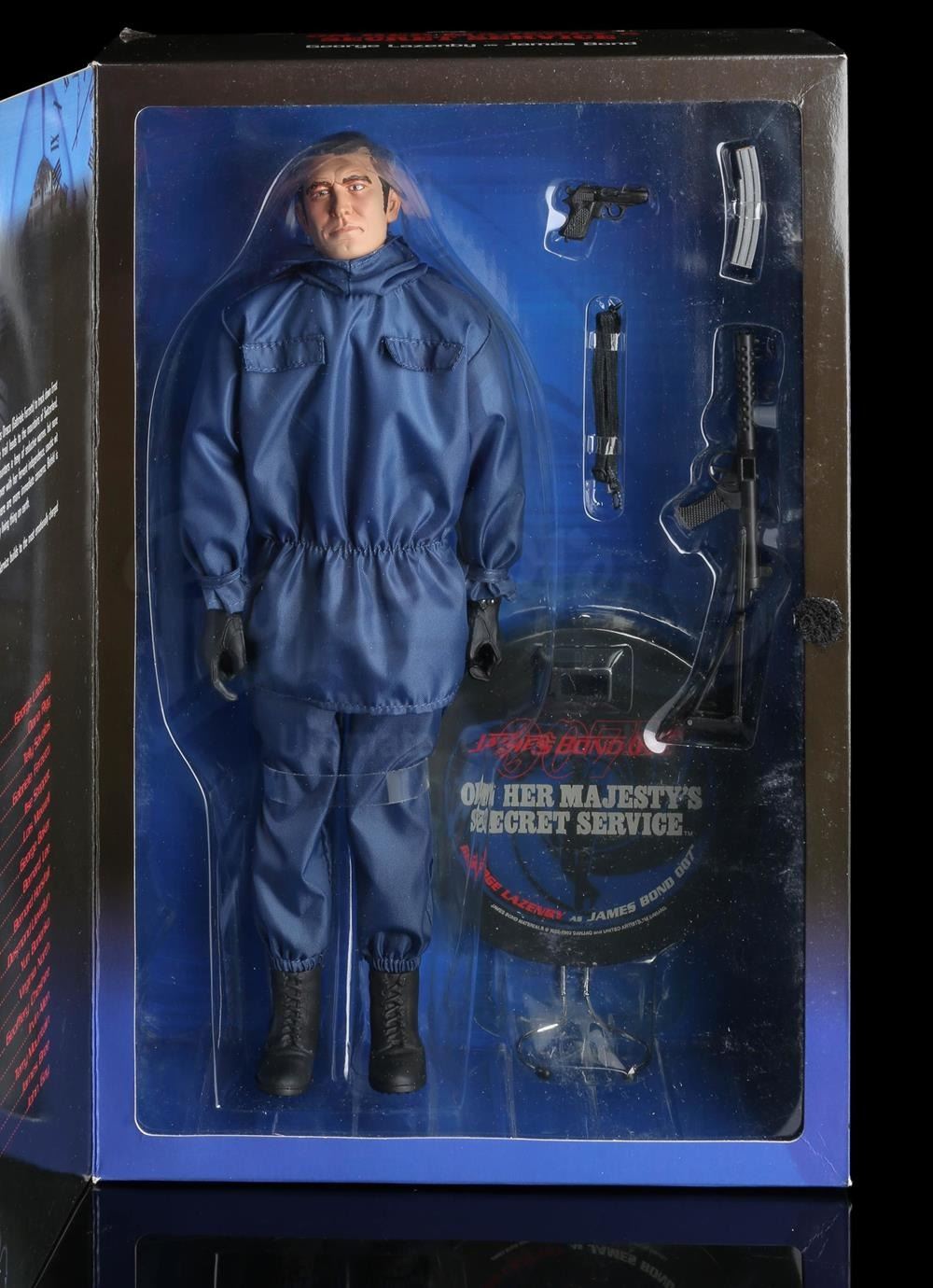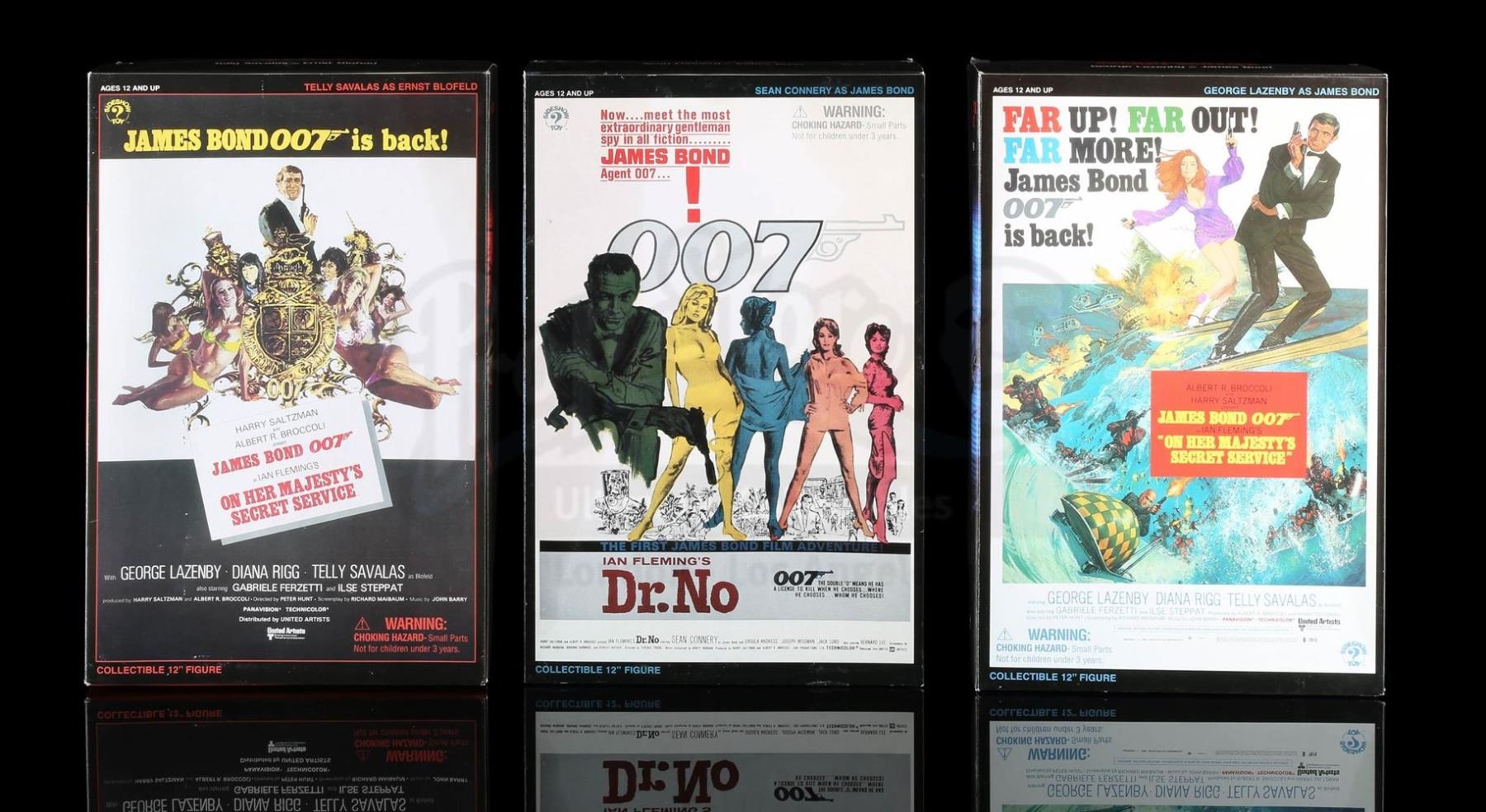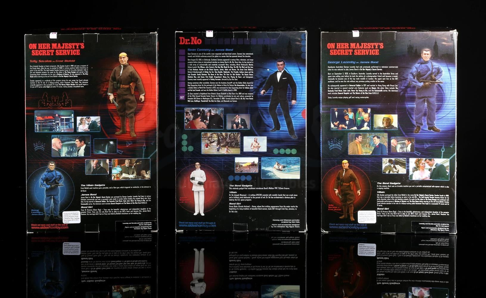Set of Three 40th Anniversary James Bond 12" Collectible Figures. Two from Her Majesty's Secret Service and one from Dr. No. The figures come in original packaging and are sealed.