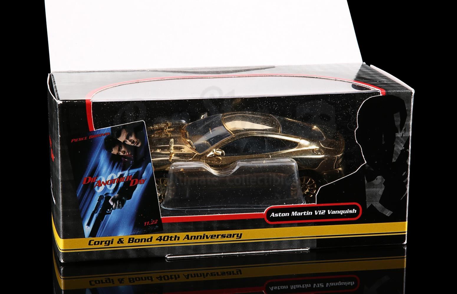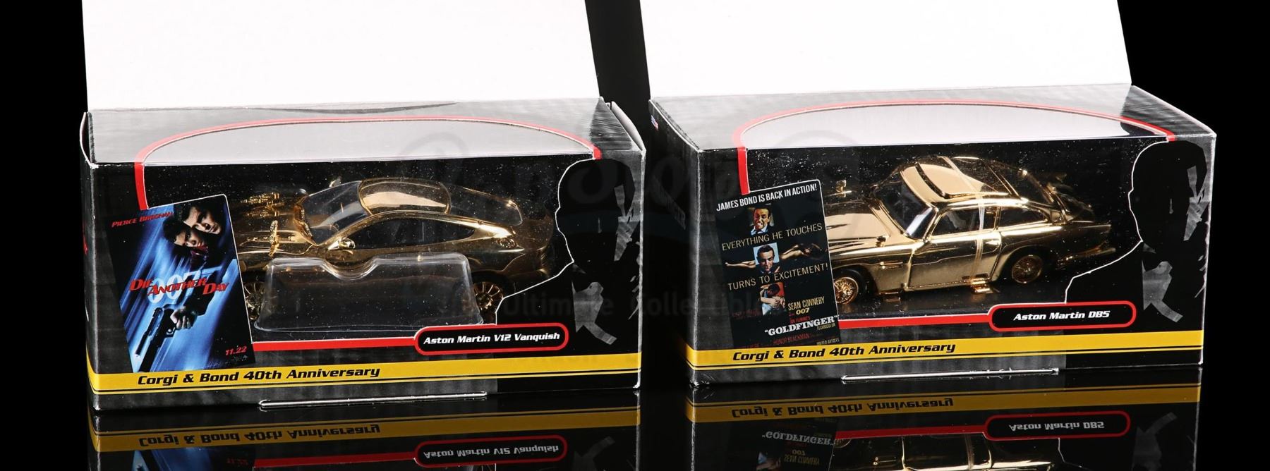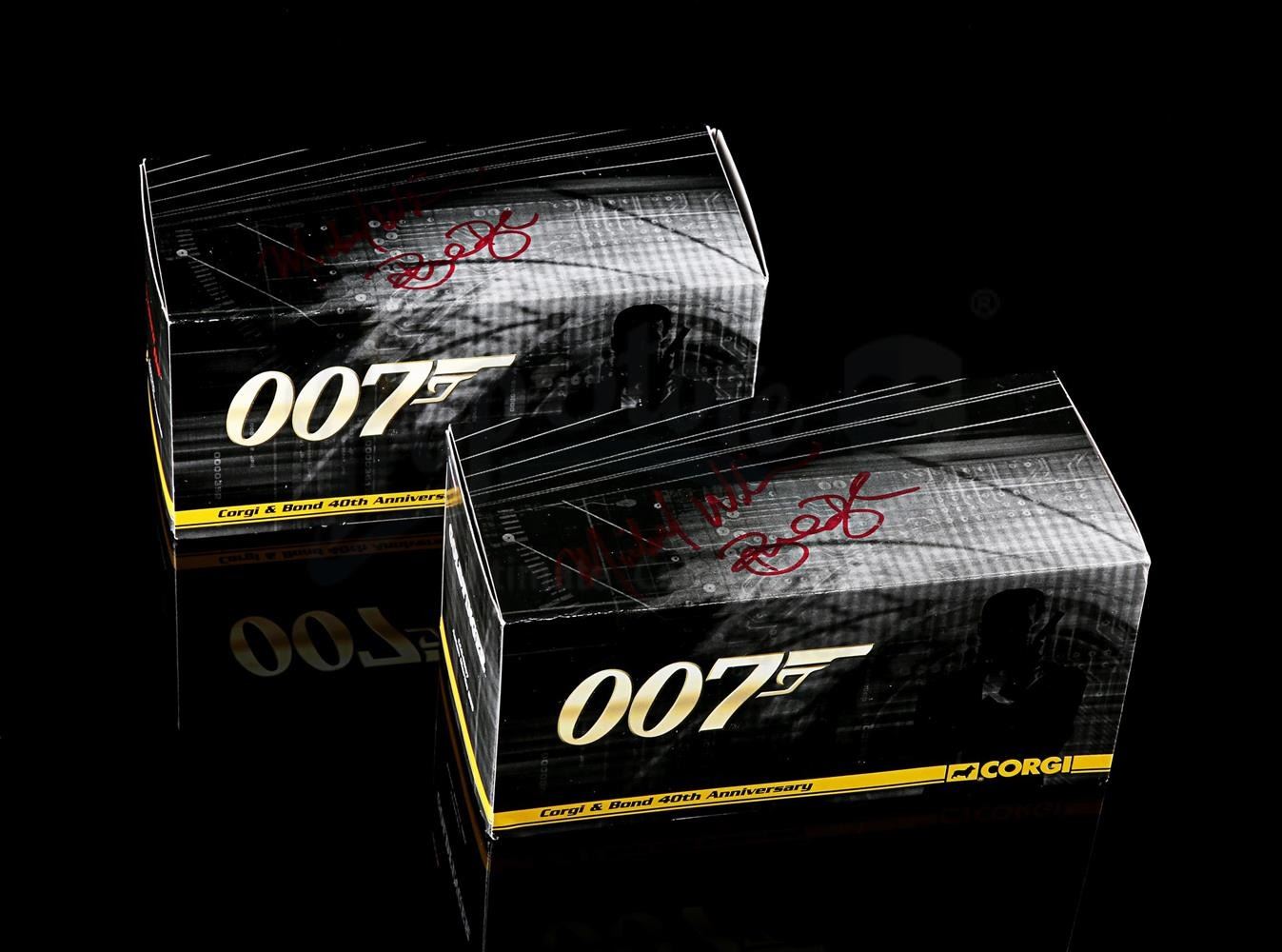 Two gold-plated vehicles in original box. Outer card sleeve signed by Barbra Broccoli and Michael G. Wilson in red ink. Comes with letter of authenticity from Corgi.