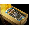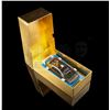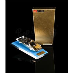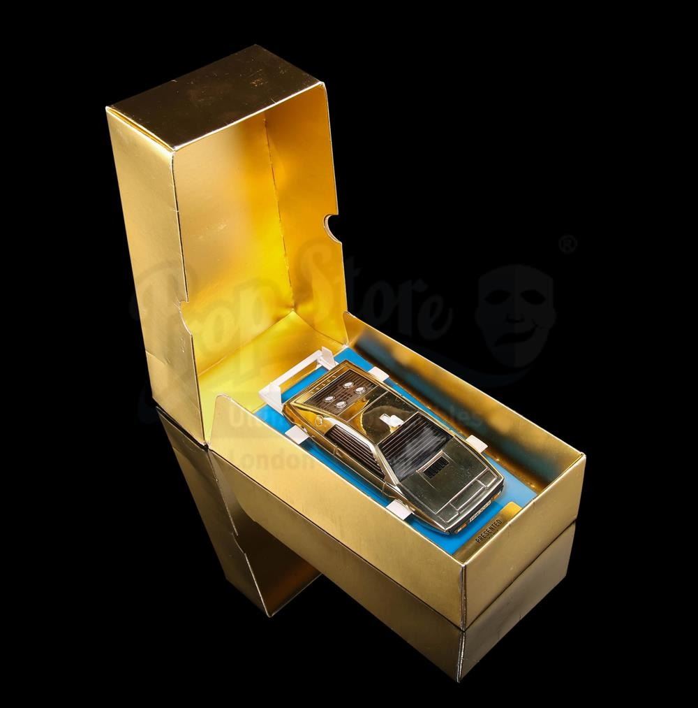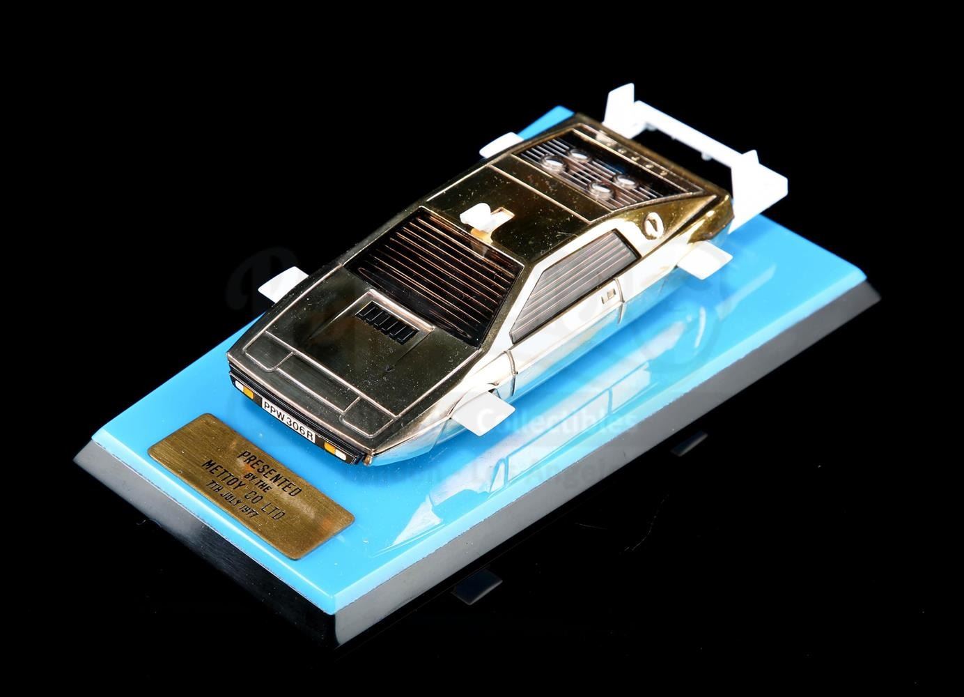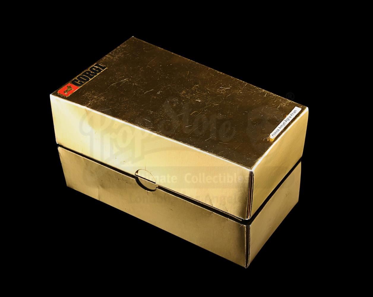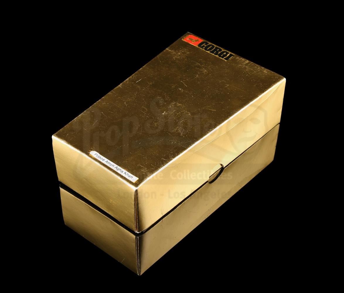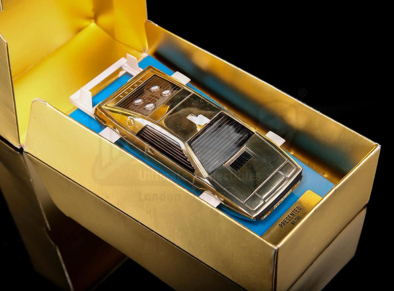 Only ten 14 carat gold Lotus model vehicles were ever made and the first was handed out at the premiere of The Spy Who Loved Me. Presented in a gold-coloured presentation card box, the gold-plated vehicle is mounted onto a blue and black display base. A hidden drawer adorns the back of the base and contains bright orange missiles. Includes carded instruction diagram. Front of the base features a plaque reading "Presented by the METTOY CO LTD 7th July 1977". The box displays the name "Prince Amyn Agha Khan", the intended owner of this item.