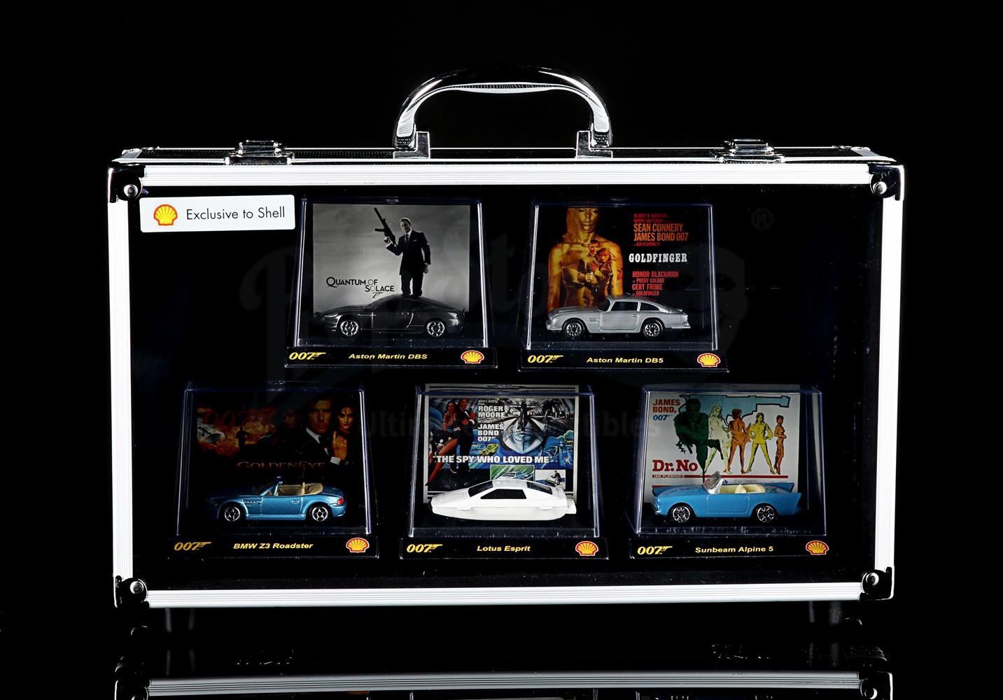A complete set of five factory-sealed model cars exclusive to Shell, in a "The Cars of Bond" presentation case.