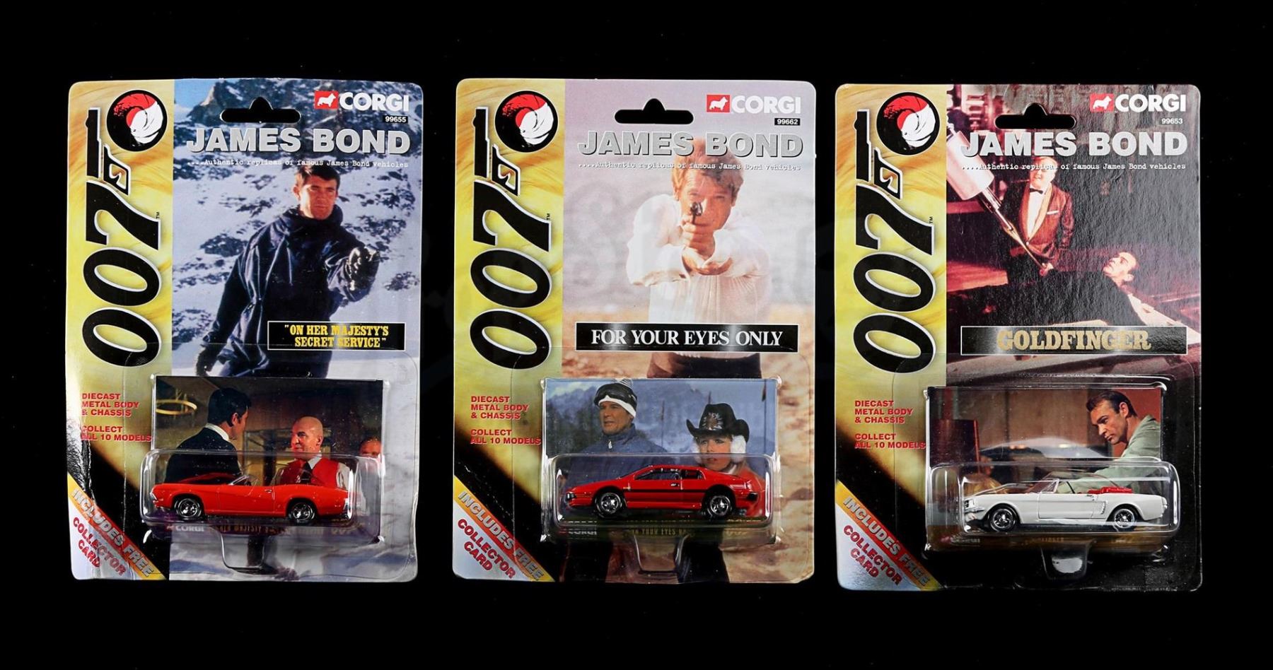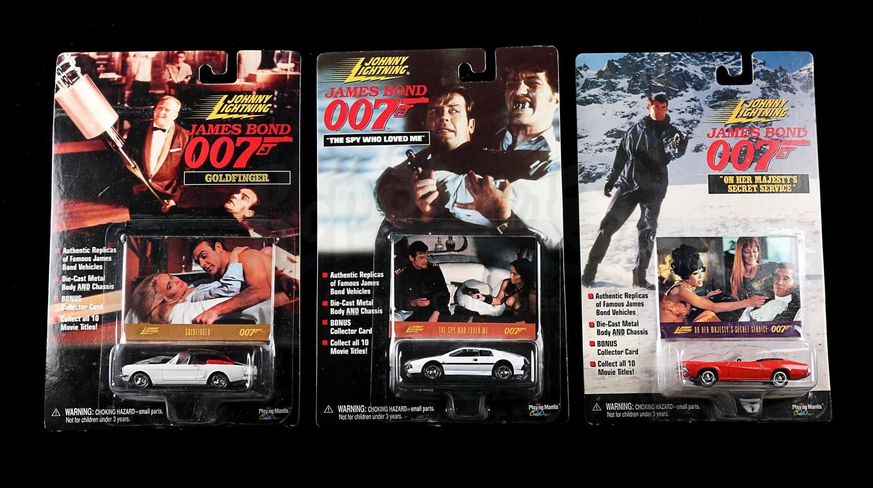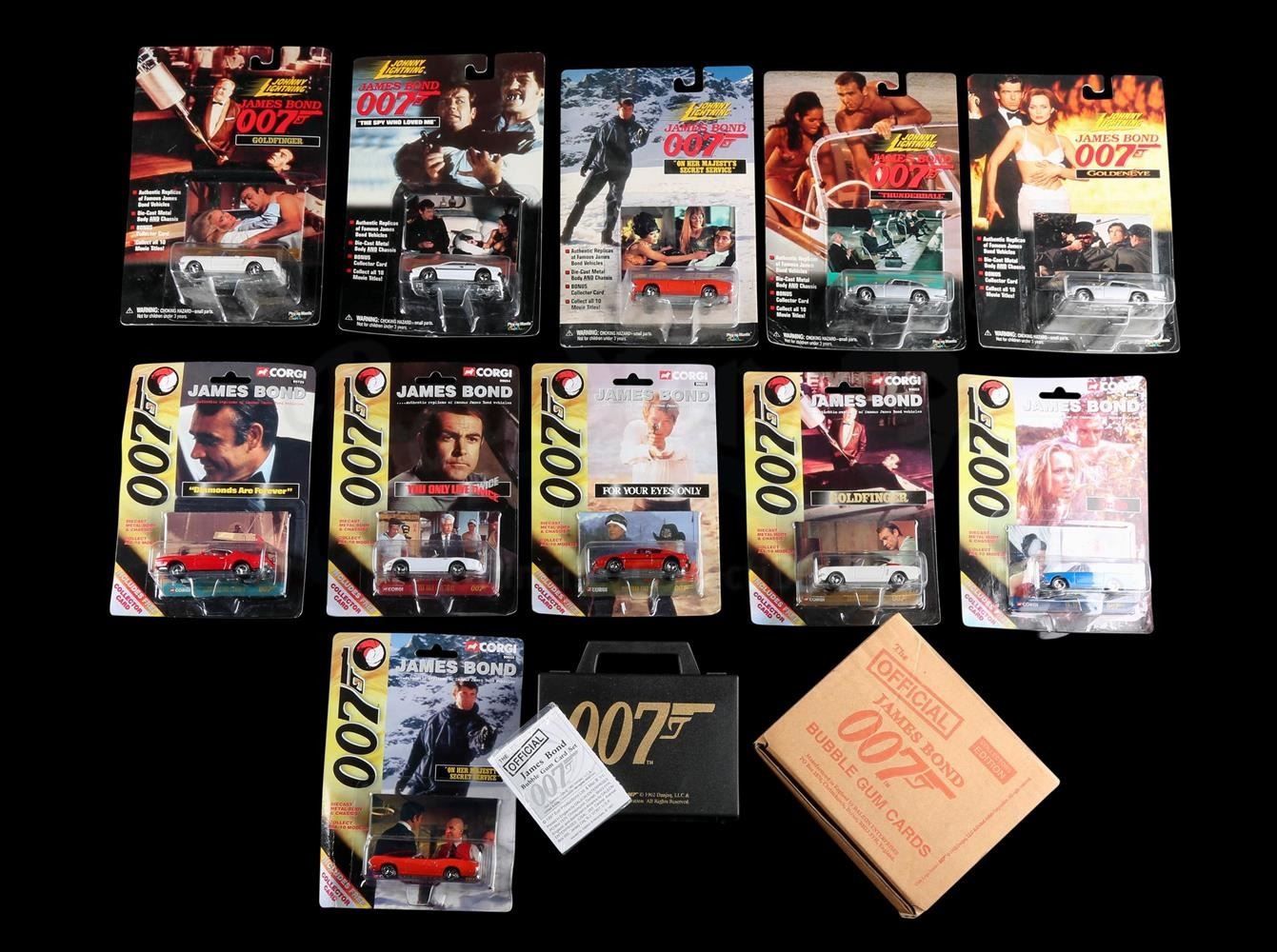 Selection of 11 James Bond die-cast model cars from Corgi and Johnny Lighting. All sealed in original punched cardbacks. Also included is a box of James Bond Bubble Gum Trading Cards.