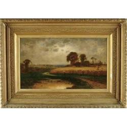 Lot # 620 JAMES BRADE SWORD (American, 1839-1915) THE WALK HOME. Large oil on canvas landscape scene shows woman in blue and red outfit walking along curving dirt road leading to farmhouse amongst several large trees. A large field of tall wheat is seen around farmhouse. Other side has small lily pond. A town is seen in the distance under cloudy skies with blue patches. Housed in what may possibly be its original fine period multi-tier gesso decorated flower frame. SIZE: 18” x 30”. CONDITION: One patch to reverse with corresponding restoration and inpainting. 9-98849 (2,000-4,000)