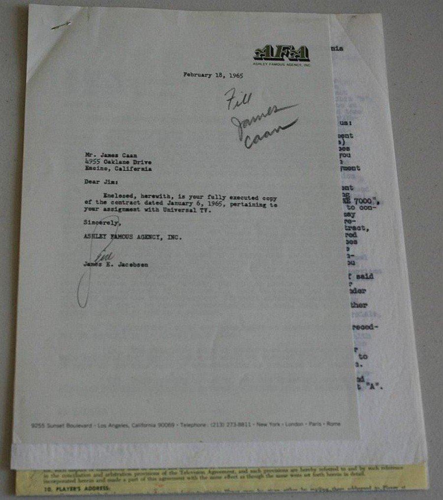 JAMES CAAN - Rare James Caan 1965 multiple hand signed contracts (15 pages, 16 signatures, 8 of which are James Caan's). These early employment contracts dated 1965 pertain to his assignment with Universal TV. 15 pages of in depth information including information of James Caan accepting employment with Paramount Pictures, Inc, to render services in a co-starring role in its feature motion picture tentatively entitled "Red Line 7000". 15 pages (18 with the 3 pages of information on the back), 16 signatures, 8 hand written James Caan signatures 5 in the name James Caan and 3 initial JC, 7 hand written Producers signatures, 5 in name and 2 initials, 1 Agency signature. In 1965 James Caan landed his first starring role in Howard Hawks' auto-racing drama Red Line 7000. Red Line 7000 is a 1965 American motion picture released by Paramount Pictures. It was directed by Howard Hawks, who also co-wrote the screenplay. It stars James Caan and Marianna Hill in a story about a young stock-car racer trying to establish himself and simultaneously juggle a tempestuous love life. James Caan would go on to star in great roles which would include his role as 'Sonny' Corleone in 1972's The Godfather. He also starred as Paul Sheldon in Stephen King's Misery, 'Big' Ed Deline in the television series Las Vegas, and as Will Ferrell's father in Elf. Condition Report: Very good.