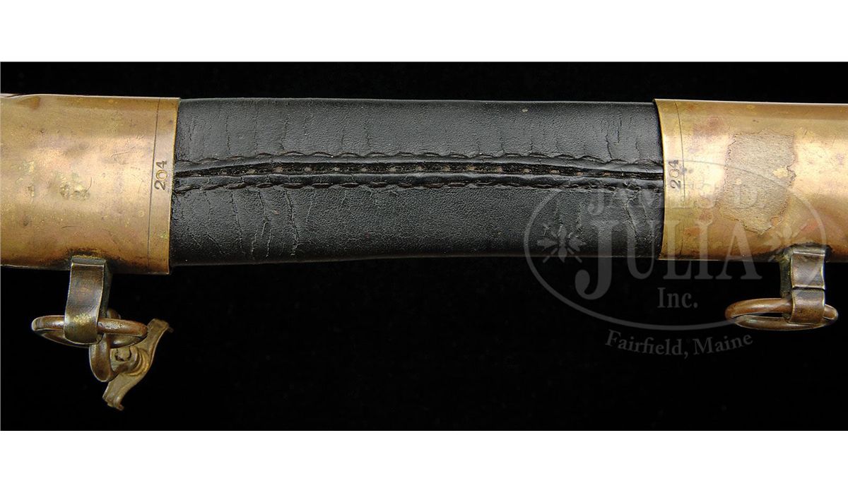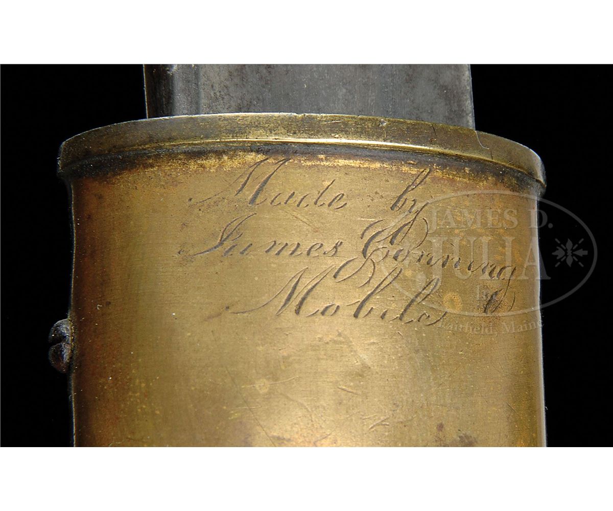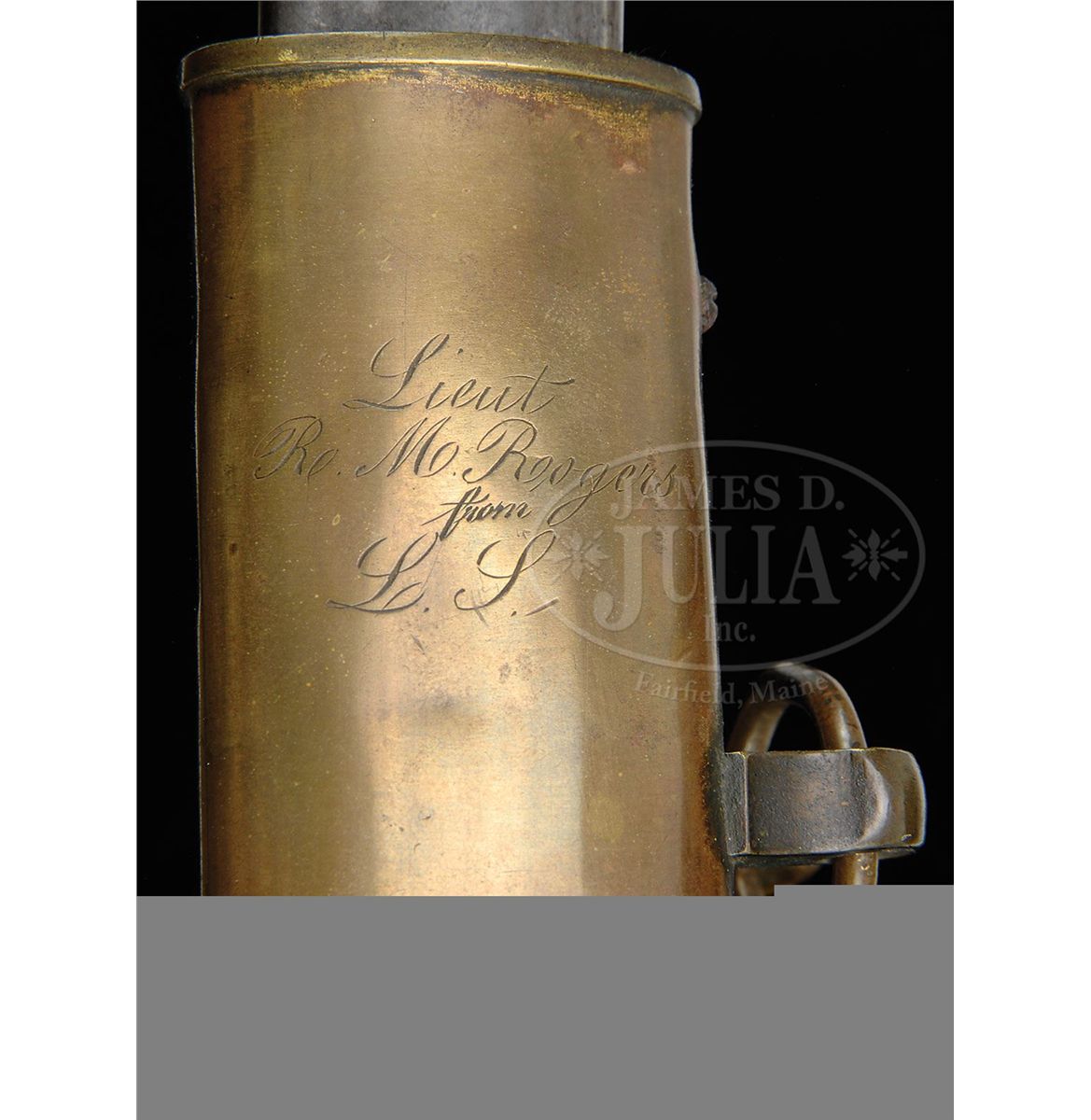 Not only is this among the finest James Conning, Mobile, Alabama, made foot officer's sword but it is also the only known presentation to a Confederate in the Revenue Marines. Lt. Rogers came from a long line of naval officers and Marines; his father William Rogers had served with Stephen Decatur on the "Enterprise" and the "Intrepid" during the War of 1812 and had been at Tripoli during the Barbary Coast War in 1804. His younger brother William F. Rogers was a U.S. Revenue Marine and later Confederate Revenue Marine. 3rd Lt Robert M. Rogers received his commission in the Confederate States Revenue Marines May 4, 1861 by order of Stephen Mallory, Secretary of the Confederate Navy. Lt. Rogers was immediately ordered to the CSS Revenue Cutter "Morgan", then stationed at Mobile, Alabama. Rogers performed his duty with efficiency, protecting Confederate assets in Mobile Bay. In December of 1861 Lt. Rogers took command of the Schooner "Clair". He transversed the Union blockade and on Feb 13, 1862 he arrived back in Mobile with a cargo of gun powder and other valuable ordnance. Within a month after his daring blockade run, Rogers was given command of the CSS gunboat "Bradford" in Pensacola, Florida and again ran the blockade from Pensacola back to Mobile. In July 1862 Rogers was ordered to Choctow Bluff, Alabama to train the men of the 36th Alabama in the use of coastal artillery guns. On August 19, 1862 Rogers was assigned to the staff of General Frank Gardner, then located in Chattanooga, Tennessee, preparing for the imminent invasion of Kentucky with Braxton Bragg. Here Rogers was in charge of ordnance. It was in this capacity that he saw active service throughout the ill fated Kentucky campaign, where according to General Gardner he served with "zeal and energy" On October 1st, in recognition for his outstanding performance and attention to duty, General Gardner recommended that Rogers be promoted to 1st Lt. of Artillery. General Gardner, in April 1863, requested Lt. Rogers be made Captain of Artillery. "Interesting note on the history of this sword is that it did not descend in the family of Lt. Rogers but in the family of Confederate Major James W. Spratley of Mobile. An examination of Major Spratley's military career and background show a close relationship to that of Captain Rogers. Rogers first met Spratley on August 19 when he was transferred to General Gardner's staff where Spratley was also on the staff. In April 1863 Rogers was ordered to Richmond, Virginia for a meeting with the War Department and perhaps visit the family of his friend Major Spratley who lived in nearby Smithfield, Virginia. In anticipation of the long, tiresome and rather difficult journey laying ahead and his inevitable return, Rogers took only the absolute essentials to make traveling as light as possible, leaving the major portion of his baggage, including his sword, with Spratley, his friend and compatriot in arms. History, of course, took a fateful hand in the sequence of events that follow and Rogers was never to see Spratley and his sword again". Spratley lived in Mobile until his death in 1912. Rogers post war residence and career remains a mystery as his life is not known after his parole on May 22, 1865 as Captain and Assistance Ordnance Officer for the State of Alabama. This most historical sword is described in detail on page 32 in William Albaugh's "Confederate Edged Weapons". Albaugh states: "This weapon was once owned by Major J. W. Spratley...on the staff of General Gardner, CSA and used at the siege of Ft. Hudson after the original owner Rogers had been killed." There are several hundreds pages of correspondence and notes concerning the history and provenance on this sword, but we cannot find any mention of Rogers' death. Rogers is also mentioned in the 1978 publication by Ralph W. Donnelly "History of the Confederate States Marine Corps". PROVENANCE: Captain Robert M. Rogers; Major James Walter Spratley; Walter W. Stephen (great-grandson); William Albaugh; James C. Harris; Southern collection. CONDITION: 29-3/4" blade is gray/bright with scattered areas of staining and pitting. The leather grip wrap is complete. The twisted brass wire is complete and tight though there is an apparent (war time?) repair and replacement of a finer twisted brass wire. Patina to brass hilt, pommel and scabbard mounts is present with scattered scratches, small dings and dents, especially in the drag. Small traces of orig gold wash is visible on hilt, pommel and top mount and also present on snap ring from sword belt still attached to top notch. SN "204" are well struck and discernible on all 3 scabbard mounts and hilt. Leather scabbard body is sound and solid with scattered cracks, scuffs and scrapes. 8-76338 JS237