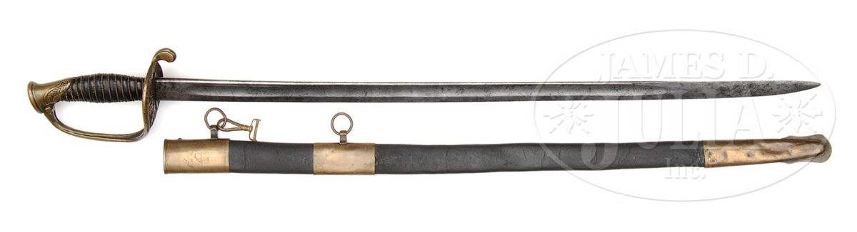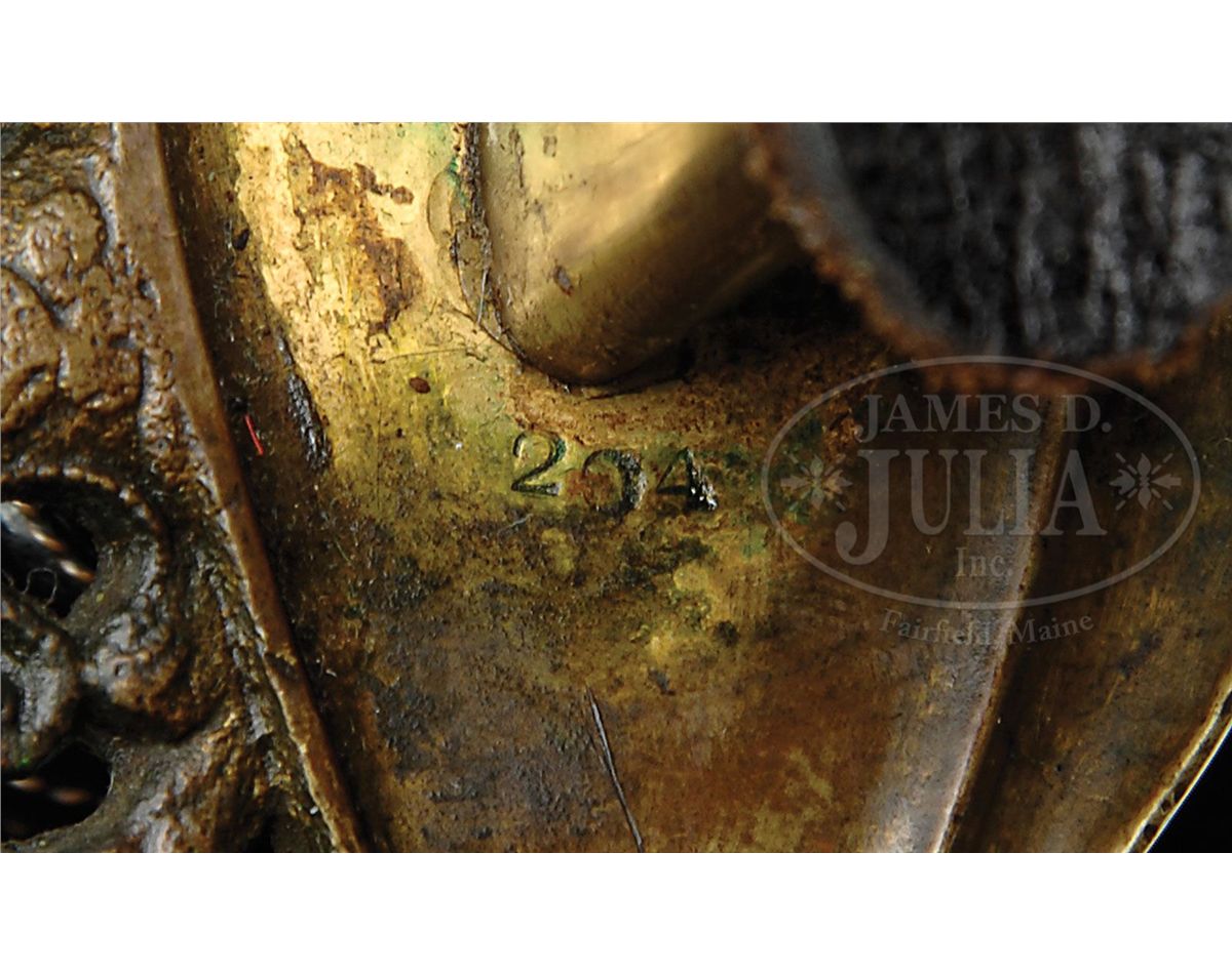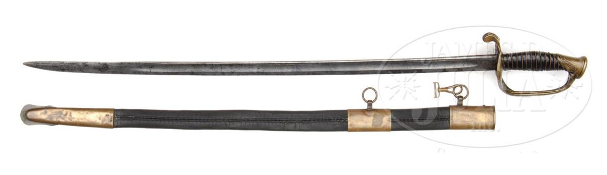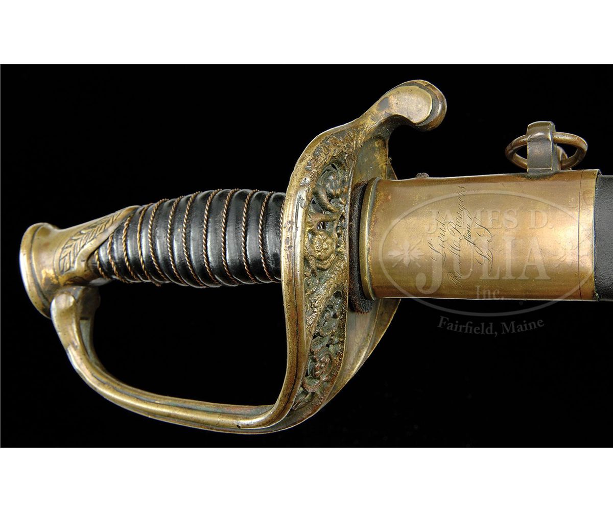 Not only is this among the finest James Conning, Mobile, Alabama, made foot officer's sword but it is also the only known presentation to a Confederate in the Revenue Marines. Lt. Rogers came from a long line of naval officers and Marines; his father William Rogers had served with Stephen Decatur on the "Enterprise" and the "Intrepid" during the War of 1812 and had been at Tripoli during the Barbary Coast War in 1804. His younger brother William F. Rogers was a U.S. Revenue Marine and later Confederate Revenue Marine. 3rd Lt Robert M. Rogers received his commission in the Confederate States Revenue Marines May 4, 1861 by order of Stephen Mallory, Secretary of the Confederate Navy. Lt. Rogers was immediately ordered to the CSS Revenue Cutter "Morgan", then stationed at Mobile, Alabama. Rogers performed his duty with efficiency, protecting Confederate assets in Mobile Bay. In December of 1861 Lt. Rogers took command of the Schooner "Clair". He transversed the Union blockade and on Feb 13, 1862 he arrived back in Mobile with a cargo of gun powder and other valuable ordnance. Within a month after his daring blockade run, Rogers was given command of the CSS gunboat "Bradford" in Pensacola, Florida and again ran the blockade from Pensacola back to Mobile. In July 1862 Rogers was ordered to Choctow Bluff, Alabama to train the men of the 36th Alabama in the use of coastal artillery guns. On August 19, 1862 Rogers was assigned to the staff of General Frank Gardner, then located in Chattanooga, Tennessee, preparing for the imminent invasion of Kentucky with Braxton Bragg. Here Rogers was in charge of ordnance. It was in this capacity that he saw active service throughout the ill fated Kentucky campaign, where according to General Gardner he served with "zeal and energy" On October 1st, in recognition for his outstanding performance and attention to duty, General Gardner recommended that Rogers be promoted to 1st Lt. of Artillery. General Gardner, in April 1863, requested Lt. Rogers be made Captain of Artillery. "Interesting note on the history of this sword is that it did not descend in the family of Lt. Rogers but in the family of Confederate Major James W. Spratley of Mobile. An examination of Major Spratley's military career and background show a close relationship to that of Captain Rogers. Rogers first met Spratley on August 19 when he was transferred to General Gardner's staff where Spratley was also on the staff. In April 1863 Rogers was ordered to Richmond, Virginia for a meeting with the War Department and perhaps visit the family of his friend Major Spratley who lived in nearby Smithfield, Virginia. In anticipation of the long, tiresome and rather difficult journey laying ahead and his inevitable return, Rogers took only the absolute essentials to make traveling as light as possible, leaving the major portion of his baggage, including his sword, with Spratley, his friend and compatriot in arms. History, of course, took a fateful hand in the sequence of events that follow and Rogers was never to see Spratley and his sword again". Spratley lived in Mobile until his death in 1912. Rogers post war residence and career remains a mystery as his life is not known after his parole on May 22, 1865 as Captain and Assistance Ordnance Officer for the State of Alabama. This most historical sword is described in detail on page 32 in William Albaugh's "Confederate Edged Weapons". Albaugh states: "This weapon was once owned by Major J. W. Spratley...on the staff of General Gardner, CSA and used at the siege of Ft. Hudson after the original owner Rogers had been killed." There are several hundreds pages of correspondence and notes concerning the history and provenance on this sword, but we cannot find any mention of Rogers' death. Rogers is also mentioned in the 1978 publication by Ralph W. Donnelly "History of the Confederate States Marine Corps". PROVENANCE: Captain Robert M. Rogers; Major James Walter Spratley; Walter W. Stephen (great-grandson); William Albaugh; James C. Harris; Southern collection. CONDITION: 29-3/4" blade is gray/bright with scattered areas of staining and pitting. The leather grip wrap is complete. The twisted brass wire is complete and tight though there is an apparent (war time?) repair and replacement of a finer twisted brass wire. Patina to brass hilt, pommel and scabbard mounts is present with scattered scratches, small dings and dents, especially in the drag. Small traces of orig gold wash is visible on hilt, pommel and top mount and also present on snap ring from sword belt still attached to top notch. SN "204" are well struck and discernible on all 3 scabbard mounts and hilt. Leather scabbard body is sound and solid with scattered cracks, scuffs and scrapes. 8-76338 JS237