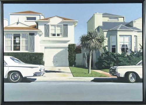 JAMES DANIEL TORLAKSON (American, 1951-) "ASHLAND AVENUE 1973". Oil on canvas realist scene shows a street side view of two side by side modern houses with cars parked in front of a cement sidewalk and curb. Shadows are cast from a sunlit view. The back stretcher has a John Berggruen Gallery, San Francisco, California label indicating artist and title. Signed lower right. Housed in a black frame which is set away from the edge of the canvas. Torlakson is known for his realist watercolors and an oil painting rarely comes on the market as large as this. A prime example of the early photo realism school whom Torlakson was one of its earliest participants. SIZE: 30-1/2" x 42". CONDITION: Very good to excellent. 9-26619