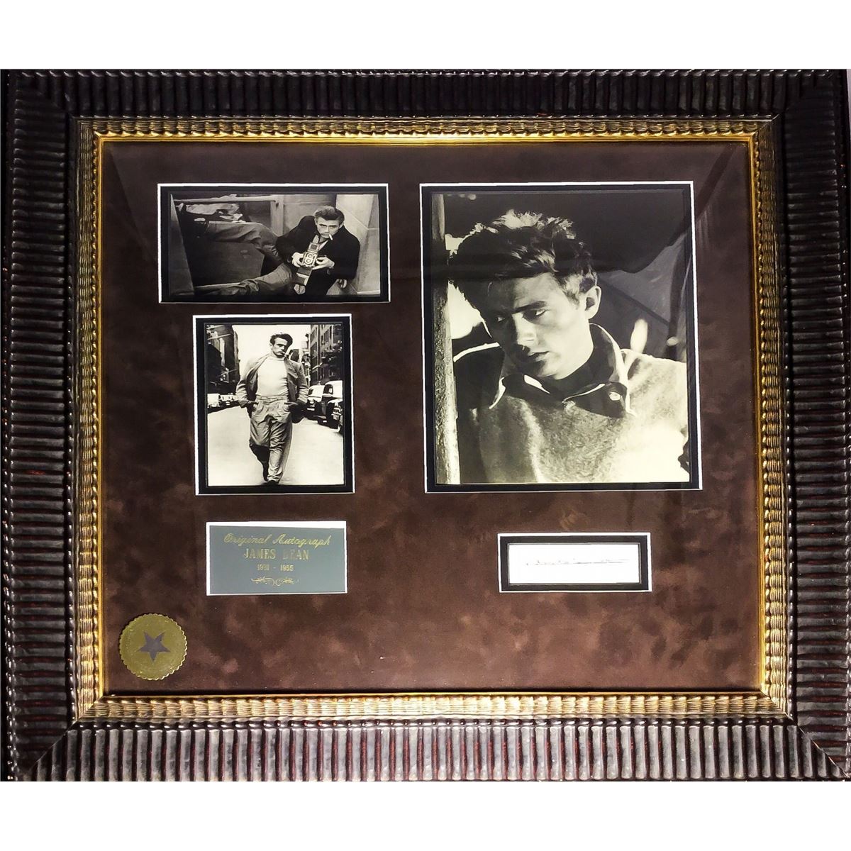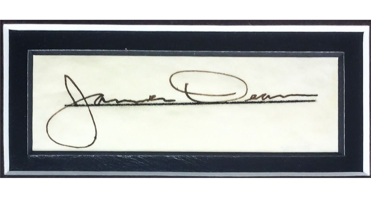 A JAMES DEAN SIGNATURE MOUNTED IN A CUSTOM DISPLAY WITH SEVERAL IMAGES OF JAMES DEAN. THE DISPLAY MEASURES 23 x 23 INCHES OVERALL AND HAS A WALT DISNEY AUTHENTICITY GUARANTEE STICKER MOUNTED ON THE DISPLAY.