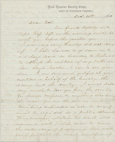 (1833 - 1864) Confederate major general of cavalry who circled McClellan's army twice, was late to the battle of Gettysburg, and in 1864 was mortally wounded at Yellow Tavern. Rare, good content war-date A.L.S. "Stuart" with postcript initialed "J.E.B." on "Head Quarters Cavalry Corps, Army of Northern Virginia" letterhead, Dec. 31, 1863, 2+pp. 4to., [n.p.], to an unnamed colonel. In part: "...Our friends [Frank] Vizatelly [British war correspondent and illustrator who came to the US in 1861 and covered the Civil War from the Confederate viewpoint] and Capt. Ross left us this morning and will be with you before this reaches you. I was very sorry Lawley [British newspaperman Francis Lawley?] did not come up. I hope however to go down on 3 or 4 days leave...to Ricmond to attend the nuptuals of my brother in law Gen'l [John R.] Cooke. I hope to see you then. I am very much gratified at your exertions in behalf of the Cavalry, the army, and the country. I would dislike very much to lose you for foreign missions or anything else during this war....Your being superceded so soon in Congress must be regarded as a public calamity...I was glad the House had the manliness and patriotism to put the bill putting in all men who claim exemption by reason of having furnished a substitute. It should be quickly followed up by the enrolling officers - so as to get our army full by spring. ..Why don't the mil. committee hurry up a report about the cav'y measures proposed - I have another scheme - to establish under command of a disabled Col. or other Field Officer - a camp of artisans...with shops, tools and materials...for all of the prisoners of war who renounce their allegiance to the enemy & take the oath to the Confed. States. Also all the deserters from the enemy to us. This class is rapidly growing...The camp should be subject to mil. discipline, the operatives to be paid for their works. Under such a man as Col. R. E. Withers it would flourish and be very profitable to the gov't. The Sec. of War has the authority to do it...These Yankees in two days in the woods would be as comfortable as I am at this moment. I am uneasy about their presence in Richmond...". In his initialed postscript (detached from the letter), Stuart adds: "Poor Sweeny the banjoist is no more. He died of the small pox during my absence. His loss is very generally felt throughout our military circle...Hurry up legislation for the cavalry & the army...". Fine condition. Contrary to Stuart's hopes, the C.S.A. never adopted his plans, though at Belle Isle and to a lesser extent in some other camps, prisoners were employed in iron works, and in constructing battlements and additions to camps.