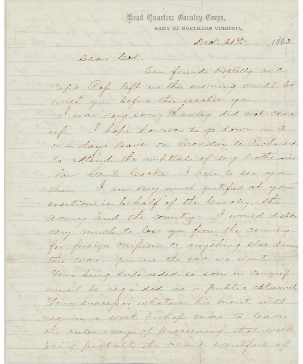 (1833 - 1864) Confederate major general of cavalry who circled McClellan's army twice, was late to the battle of Gettysburg, and in 1864 was mortally wounded at Yellow Tavern. Rare, good content war-date A.L.S. "Stuart" with postcript initialed "J.E.B." on "Head Quarters Cavalry Corps, Army of Northern Virginia" letterhead, Dec. 31, 1863, 2+pp. 4to., [n.p.], to an unnamed colonel. In part: "...Our friends [Frank] Vizatelly [British war correspondent and illustrator who came to the US in 1861 and covered the Civil War from the Confederate viewpoint] and Capt. Ross left us this morning and will be with you before this reaches you. I was very sorry Lawley [British newspaperman Francis Lawley?] did not come up. I hope however to go down on 3 or 4 days leave...to Ricmond to attend the nuptuals of my brother in law Gen'l [John R.] Cooke. I hope to see you then. I am very much gratified at your exertions in behalf of the Cavalry, the army, and the country. I would dislike very much to lose you for foreign missions or anything else during this war....Your being superceded so soon in Congress must be regarded as a public calamity...I was glad the House had the manliness and patriotism to put the bill putting in all men who claim exemption by reason of having furnished a substitute. It should be quickly followed up by the enrolling officers - so as to get our army full by spring. ..Why don't the mil. committee hurry up a report about the cav'y measures proposed - I have another scheme - to establish under command of a disabled Col. or other Field Officer - a camp of artisans...with shops, tools and materials...for all of the prisoners of war who renounce their allegiance to the enemy & take the oath to the Confed. States. Also all the deserters from the enemy to us. This class is rapidly growing...The camp should be subject to mil. discipline, the operatives to be paid for their works. Under such a man as Col. R. E. Withers it would flourish and be very profitable to the gov't. The Sec. of War has the authority to do it...These Yankees in two days in the woods would be as comfortable as I am at this moment. I am uneasy about their presence in Richmond...". In his initialed postscript (detached from the letter), Stuart adds: "Poor Sweeny the banjoist is no more. He died of the small pox during my absence. His loss is very generally felt throughout our military circle...Hurry up legislation for the cavalry & the army...". Fine condition. Contrary to Stuart's hopes, the C.S.A. never adopted his plans, though at Belle Isle and to a lesser extent in some other camps, prisoners were employed in iron works, and in constructing battlements and additions to camps.