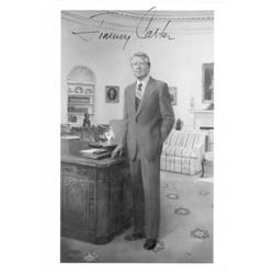 JAMES E. CARTER: (b. 1924) Thirty-ninth President of the United States who engineered a break-through in Arab-Israeli relations. S.P. 4" x 6" color, a reproduction of a fine full-length painting of Carter, nicely signed at top. Fine. $30-60