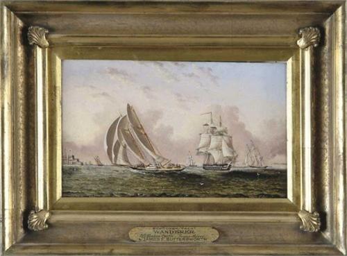 JAMES EDWARD BUTTERSWORTH (American, 1817-1894) “SCHOONER YACHT “WANDERER” OFF BELEM CASTLE-TAGUS RIVER”. Oil on board nautical scene shows a two-mast yacht in full sail with thirteen figures aboard sailing right to left. A large three-mast galleon is in full sail sailing towards viewer. A three-mast tall ship off right land flies American flag. Other boats are seen on horizon. A castle with flags is seen on left side. All under a pink and light blue sky. Signed lower right “J E Buttersworth”. Housed in a replacement gilt shell decorated molded wood frame with gold liner having an artist tag with title. SIZE: 8” x 13”. CONDITION: Very good, minor spot inpainting. 9-27908