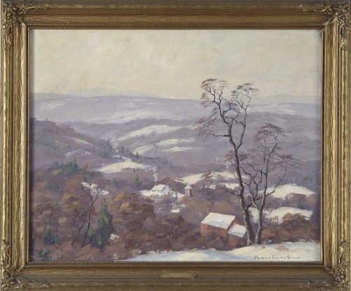 JAMES EMERY GREER (American, -1948) HAZEY DAY, WINTER. Oil on board winter scene shows a valley dotted with houses in a colorful landscape. Signed lower right. Housed in a period gesso frame. SIZE: 16" x 20". CONDITION: Very good. 9-27419