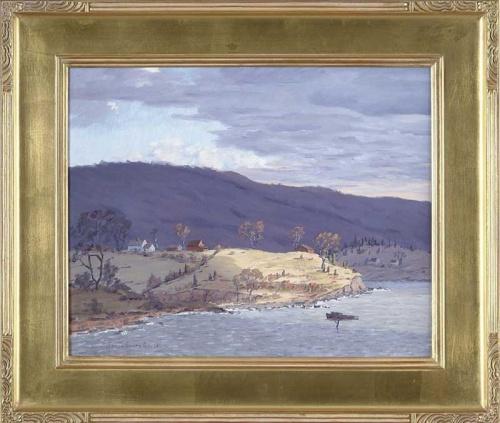JAMES EMERY GREER (American, -1948) NEW ENGLAND COASTAL SCENE. Oil on board scene shows several New England connected houses on hillsides with water and boat. Purple mountains are seen in background. Signed lower left. Housed in fine gilt Arts & Crafts style replacement frame. SIZE: 16" x 20". CONDITION: Very good. 9-27420