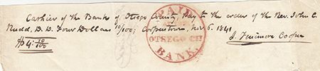 (1789 - 1851) American novelist. When challenged by his wife to write, he created the classics The Last of the Mohicans and The Deerslayer. A.D.S., a holograph check: "Cashier of the Bank of Ostego County, pay to the order of Rev. John C. Rudd D.L. Four Doll and 10/100: Cooperstown, Nov.5, 1841, J. Fenimore Cooper". Rev. John C. Rudd was a famous preacher of his time. Includes an engraving of James Fenimore Cooper. Very good with ample margins for framing.