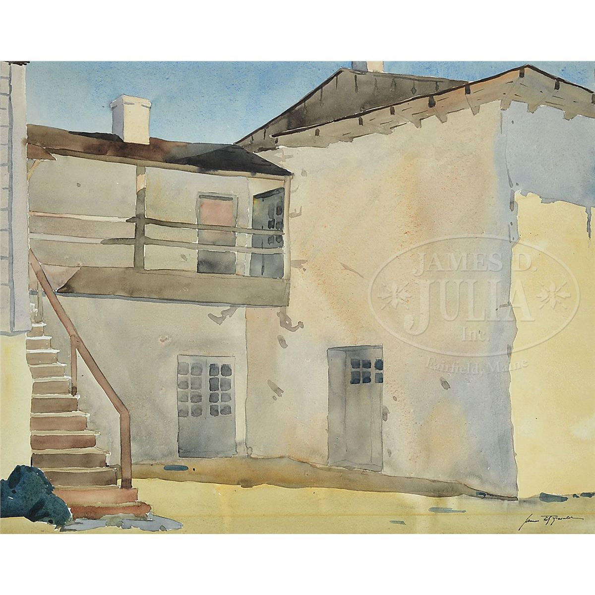 Watercolor on paper Housed in an ivory modern matte Signed "James Fitzgerald", lower right; also titled "Stairs to House" with "F-41" on verso Note: We believe this depicts Robert Louis Stevenson's House on Houston St. in Monterey, CA SIZE: Sight: 19-1/2" x 24-1/4". Overall: 27" x 31" CONDITION: Foxing lines at previous frame edge 9-29143