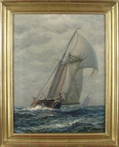 JAMES GALE TYLER (American, 1855-1931) ON THE WAY TO PORT. Oil on canvas marine scene shows a fully laden fishing boat rushing to port. In full sail having two masts and three men on board. Another boat is seen off right side. Signed lower right "James G. Tyler". Housed in a fine gilt molded wood replacement frame. SIZE: 20" x 15". CONDITION: Very good. 9-27054