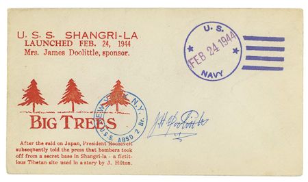 (1896 - 1993) American aviator who gained fame both as a racing pilot and as leader of the first air raid on Tokyo during World War II. Commemorative postal cover honoring the USS SHANGRI-LA, bears a war-date Navy cancel of Feb. 24, 1944 and is nicely signed in blue ink.