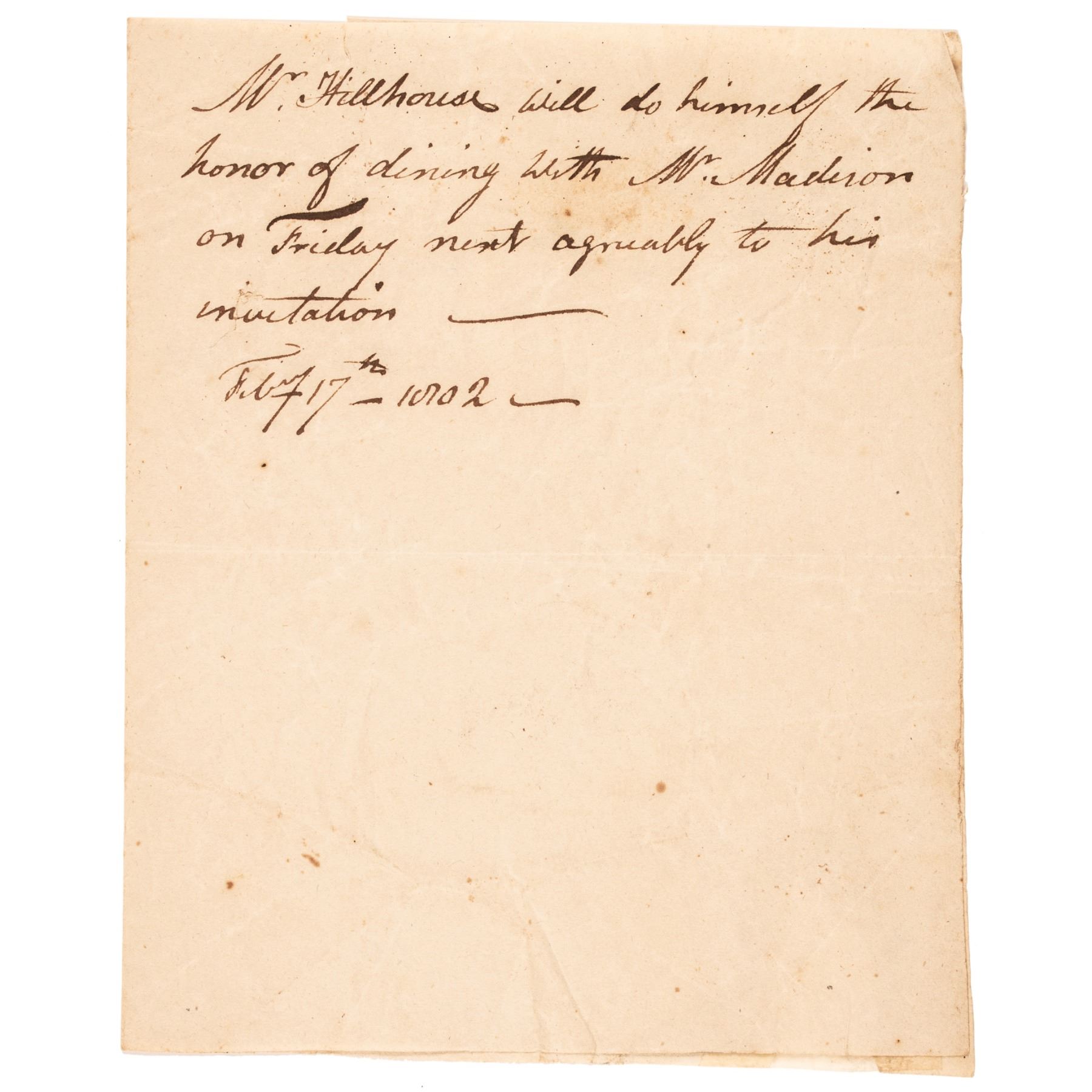 1. "Mr. Hillhouse will do himself the honor of dining with Mr. Madison on Friday next agreeably to his invitation. Feb. 17th, 1802". Addressed on the reverse to: "The Hon'ble Mr. Madison - Secretary of State". Measures 5" x 6". Choice Very Fine.