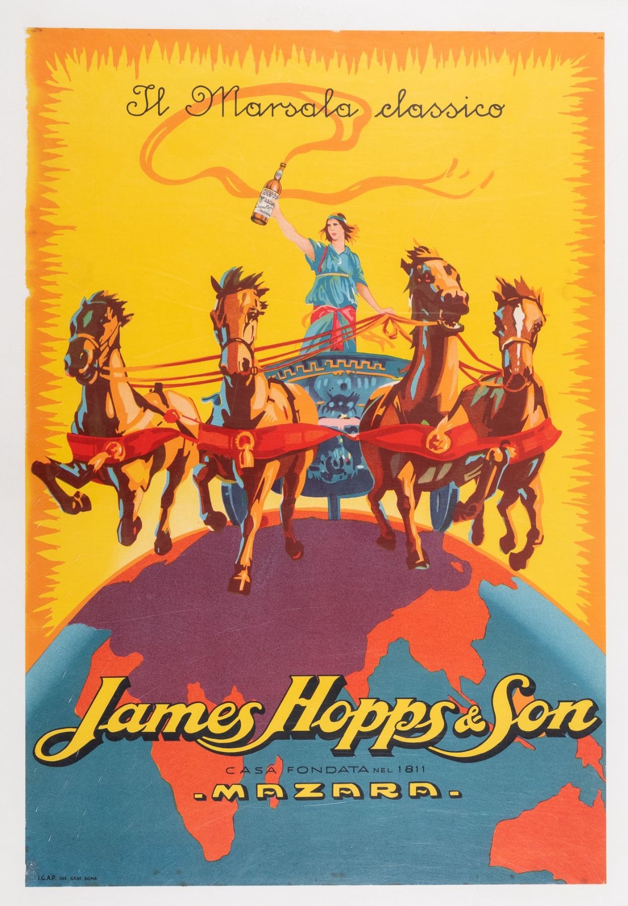 Vintage advertisement for James Hopps & Sons marsala wine, I.G.A.P. Off. Graf. Roma, 1932, linen-backed, 12 x 18 inches.