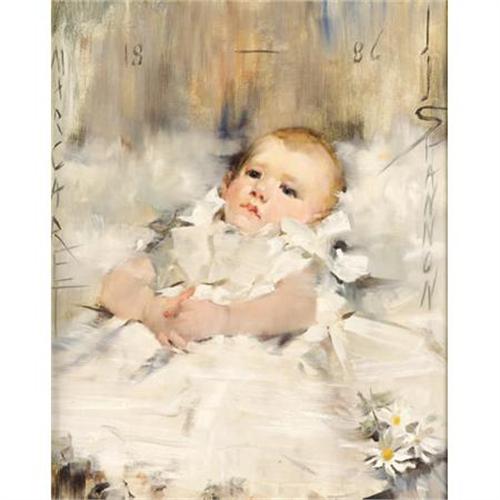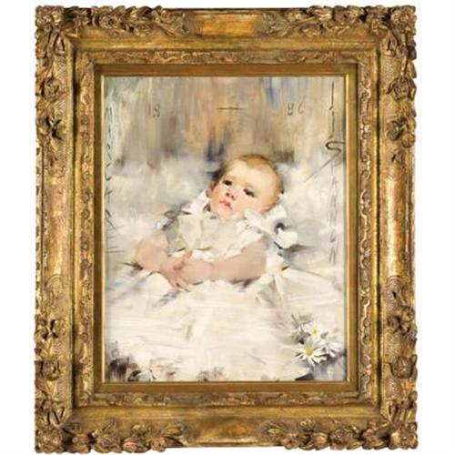 <B>JAMES JEBUSA SHANNON (British/American, 1862-1923)</B></I><BR><I>Baby in a Ruffled Dress</B></I>, 1886<BR>Oil on canvas<BR>20 x 16 inches (50.8 x 40.6 cm)<BR>Signed along right edge: <I>J J SHANNON</B></I><BR>Inscribed along left edge: <I>MARGARET</B></I><BR> <BR>PROVENANCE:<BR>Peterson Galleries, Beverly Hills, California (label verso);<BR>Hirschl & Adler Galleries Inc., New York (label verso);<BR>Private collection, Fairfield, Texas.<B>Condition Report:</B> Canvas has been wax relined, scattered areas with minor craquelure, otherwise excellent condition.<BR><BR><b>Shipping:</b> Requires 3rd Party Shipping (<a target="_blank" href="http://www.heritageauctions.com/common/shipping.php">view shipping information</a>)