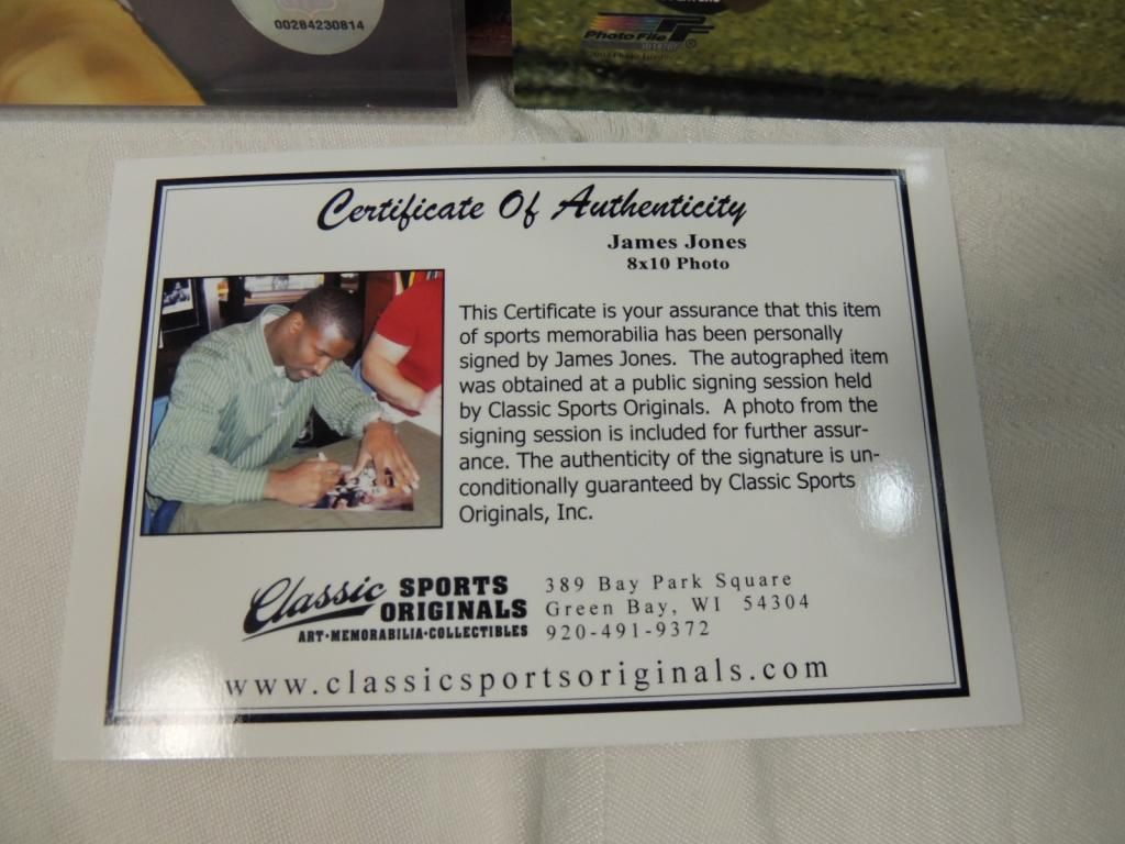JAMES JONES AUTOGRAPHED 8X10 PHOTO WITH COA FROM CLASSIC SPORTS ORIGINALS. AS SHOWN. VIEW PICTURE FOR DETAIL. PLEASE BE ADVISED, AND INFORMED REGARDING SIGNATURES OR AUTOGRAPHS THAT WE SELL AT AUCTION: WE ARE NOT AUTHENTICATORS, AND WE DO NOT AUTHENTICATE, OR VALIDATE ANY AUTOGRAPHS OR SIGNATURES THAT WE OFFER AT AUCTION. SOME AUTOGRAPHS OR SIGNATURES MAY COME WITH AN AUTHENTICATION FROM ANY ONE OF LITERALLY HUNDREDS OF AUTHENTICATORS ACROSS THE COUNTRY, AND AROUND THE WORLD. WE DO NOT ENDORSE ANY AUTHENTICATOR, NOR DO WE GUARANTEE THAT ANY AUTOGRAPH OR SIGNATURE IS AUTHENTIC, OR THAT IT WILL PASS AUTHENTICATION BY ANY AUTHENTICATOR. ALL AUTOGRAPHS OR SIGNATURES ARE SOLD