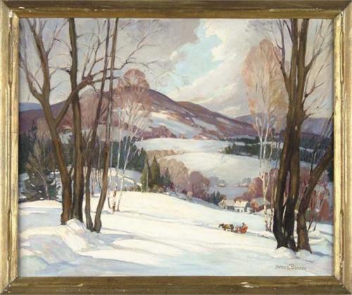 JAMES KING BONNAR (American, 1885-1961) "NEW ENGLAND WINTER". Oil on canvas winter scene shows a red sleigh with figures behind horse on a snow covered hillside with hills and house dotted valley below. A fine New England scene. Signed lower right "James K. Bonnar" Housed in its original gilt carved wood frame. Original artist label to reverse. SIZE: 25" x 30". CONDITION: Very good, a minor inpainted chip. 9-27327