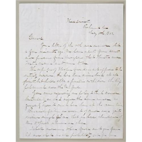 <B>JAMES LONGSTREET AUTOGRAPH LETTER SIGNED, RICHMOND, VIRGINIA 1863.</B></I> Longstreet (1821 - 1904) was one of the foremost Confederate generals of the American Civil War, the principal subordinate to General Robert E. Lee, who called him his "Old War Horse." He served under Lee as a corps commander for many of the famous battles fought by the Army of Northern Virginia in the Eastern Theater, but also with Gen. Braxton Bragg in the Army of Tennessee in the Western Theater. Biographer and historian Jeffry D. Wert wrote that "Longstreet ... was the finest corps commander in the Army of Northern Virginia; in fact, he was arguably the best corps commander in the conflict on either side. James Longstreet ALS "<I>J. Longstreet</B></I>". Two pages, 7.75” x 9.75” on blue lined paper. Head Quarters, Richmond Va. July 8th, 1863, in period ink to General D. H. Hill. <I>n part <I>“General, your letter of the 5th was received but a few minutes ago. We have reports from scouts and persons from Maryland that Hunter’s and Fosters Armies are to come to be…he has been near the us fort Arpaahnak Burnsides failure on account of mind was quite evident enough to me had abundance of time to operate wherever we chose….The enemy’s Cavalry is still at Columbia and may try to effect his escape by uniting with Foster…Have all roots me might take blocked off for great distance… I am trying to get a mount for Hoods Division to send in pursuit , I wish that you would import every horse that you may be able to find not in company use on farms. This is no time to have horses for pleasure. All such must be put into service. If you do not need them send them here. --- I remain General, yours most respectfully Signed J. Longstreet.” </B></I> <BR><BR><B>Condition:</B></I> Fine to very fine.<BR><BR><b>Shipping:</b> Flat Material, Small (<a target="_blank" href="http://www.heritageauctions.com/common/shipping.php">view shipping information</a>)