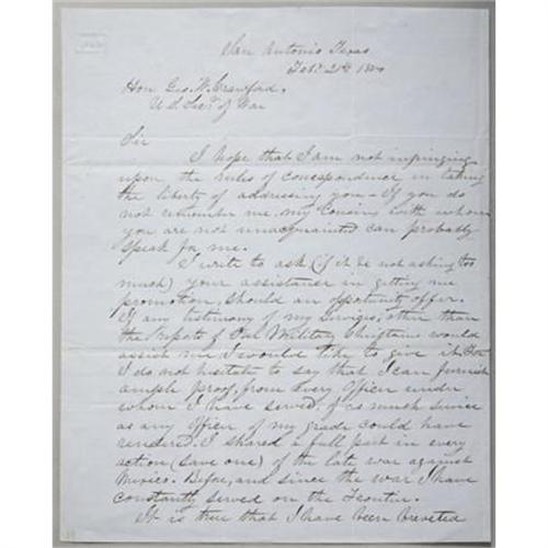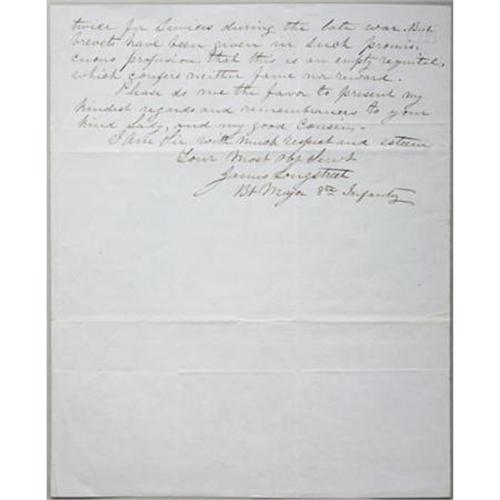 <B>JAMES LONGSTREET EARLY AUTOGRAPH LETTER SIGNED,1850.</B></I> Longstreet was one of the foremost Confederate generals of the American Civil War, the principal subordinate to General Robert E. Lee, who called him his "Old War Horse." He served under Lee as a corps commander for many of the famous battles fought by the Army of Northern Virginia in the Eastern Theater, but also with Gen. Braxton Bragg in the Army of Tennessee in the Western Theater. Biographer and historian Jeffry D. Wert wrote that "Longstreet ... was the finest corps commander in the Army of Northern Virginia; in fact, he was arguably the best corps commander in the conflict on either side." <BR><B></B></I><BR>Very early ALS. Two pages, quarto, dated February 21, 1850 from San Antonio, Texas. Written to secretary of War George W. Crawford. <I>“Sir I hope that I am not infringing upon the rules of correspondence in taking the liberty of addressing you. If you do not remember me, my cousins with whom you are not unacquainted can probably speak for me. I write to ask, (if it be not asking to much) your assistance in getting me promotion, should an opportunity offer. If any testimony of my services; other than the reports of our Military Chieftains would assist me; I would like to give it. For I do not hesitate to say that I can furnish ample proof, from every officer under whom I have served, is as much service as any officer of my grade could have rendered. I shared a full part in every action of the late war against Mexico. Before, and since the war I have constantly served on the Frontier. It is true that I have been brevetted twice for services during the late war. But brevets have been given in such promiscuous profusion, that this is an empty requital, which confers neither fame nor reward. Please do me the favor to present my kindest regards and remembrances to your kind lady, and my good cousins. I am Sir with much respect and esteem, your most obt Servt, James Longstreet Bt. Major 8th Infantry”</B></I> A superb early letter from Longstreet, who would not be promoted until aligning himself with the Confederate cause. <BR><BR><B>Condition:</B></I> Very fine.<BR><BR><b>Shipping:</b> Flat Material, Small (<a target="_blank" href="http://www.heritageauctions.com/common/shipping.php">view shipping information</a>)