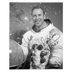 <b>1247. JAMES LOVELL </b>(b. 1928) American astronaut who served as pilot on the Gemini 7 and 12 missions, Apollo 8, and on the ill-fated Apollo 13 aborted mission. S.P. 8" x 10" color showing Lovell half-length in a pressure suit, a globe of the moon before him, and a space scene in the background, signed "<i>James Lovell Apollo 13</i>". Fine.<b> $300-400</b>