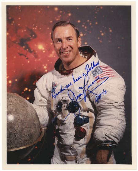 (b. 1928) American astronaut who served as pilot on the Gemini 7 and 12 missions, Apollo 8, and on the ill-fated Apollo 13 aborted mission. Fine and rare S.P. 8" x 10" color, showing Lovell half-length in a pressure suit, a globe of the moon before him, and a space scene in the background. Signed in blue adding his famous understatement spoken upon the explosion of Apollo 13's oxygen system tank: "Houston we have a problem James Lovell Apollo 13". Very fine.