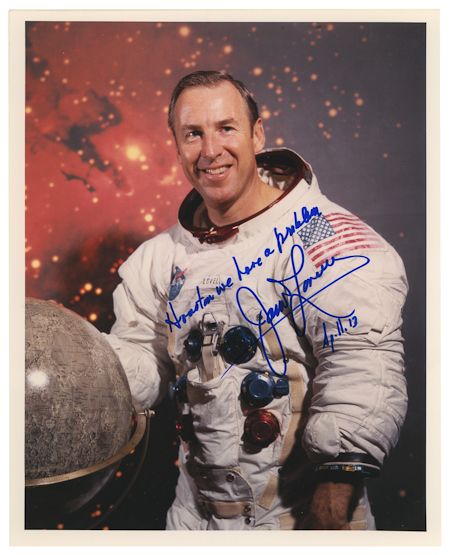 (b. 1928) American astronaut who served as pilot on the Gemini 7 and 12 missions, Apollo 8, and on the ill-fated Apollo 13 aborted mission. Fine and rare S.P. 8" x 10" color, showing Lovell half-length in a pressure suit, a globe of the moon before him, and a space scene in the background. Signed in blue adding his famous understatement spoken upon the explosion of Apollo 13's oxygen system tank: "Houston we have a problem James Lovell Apollo 13". Very fine.