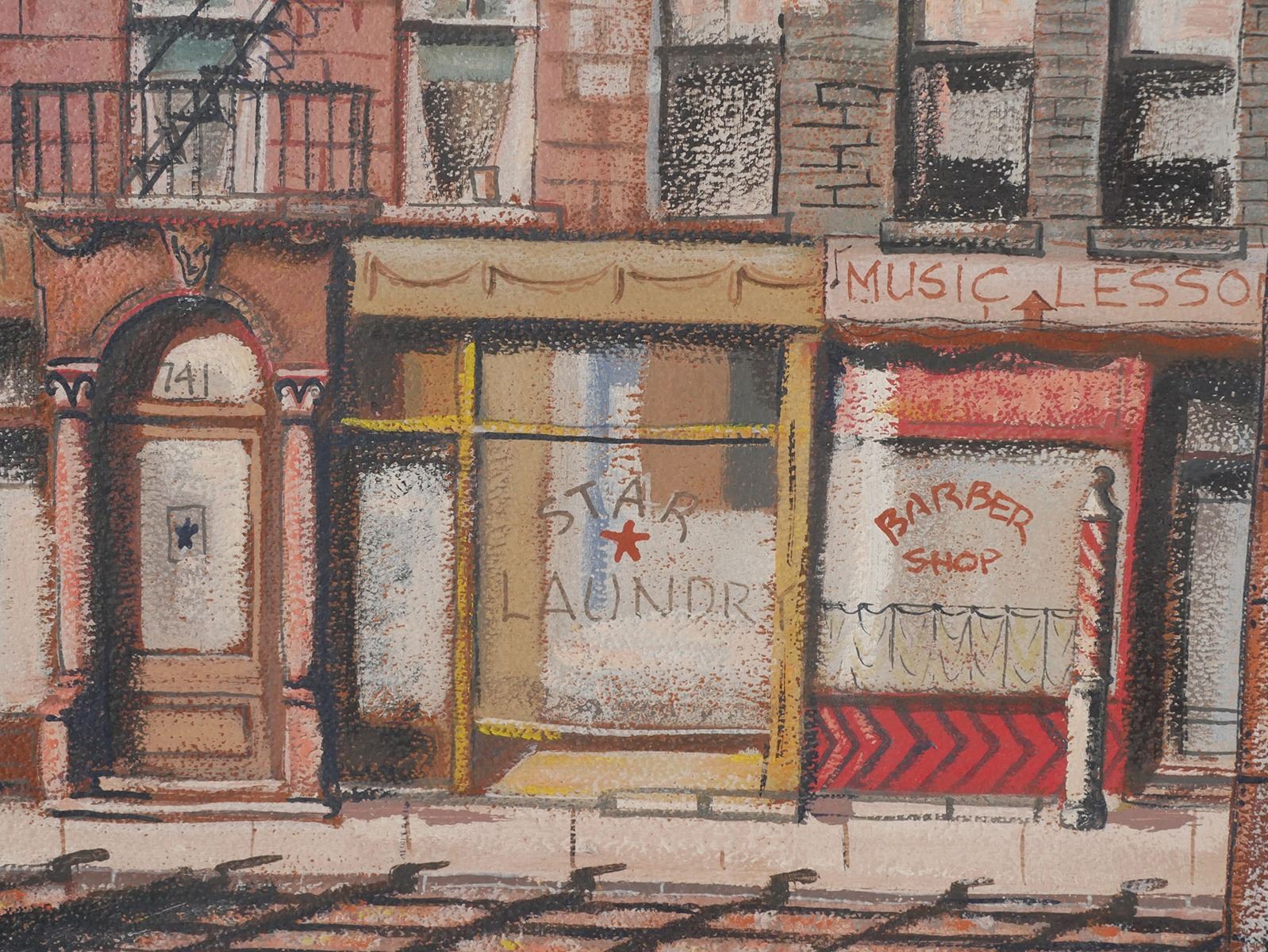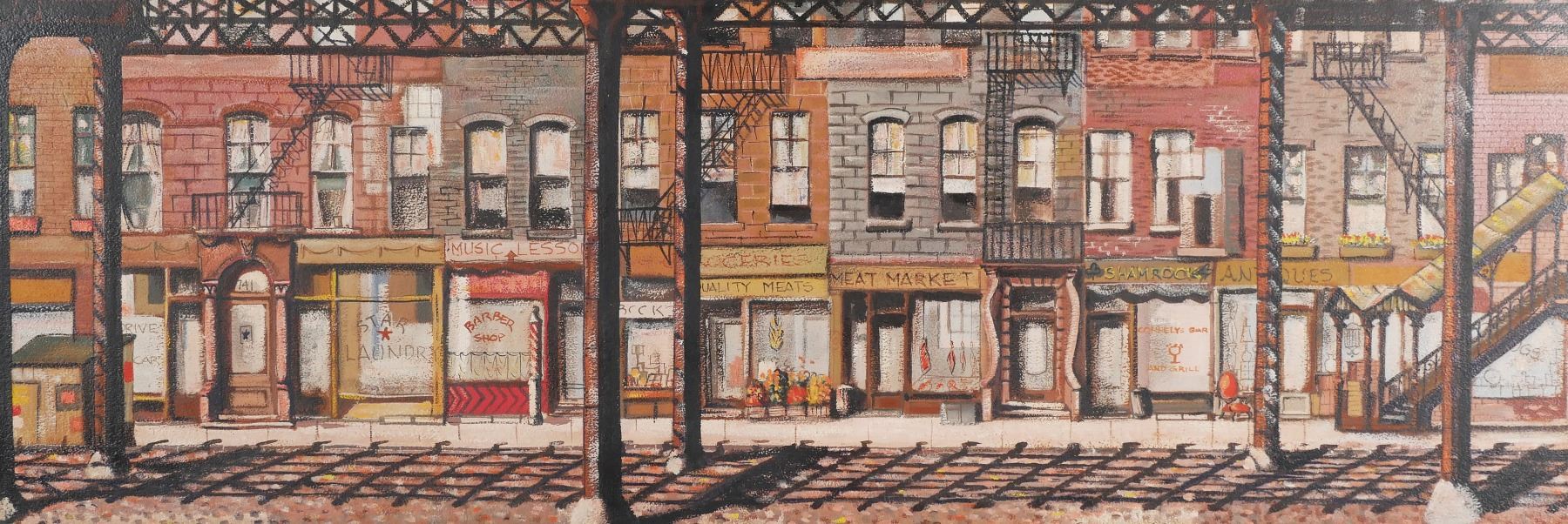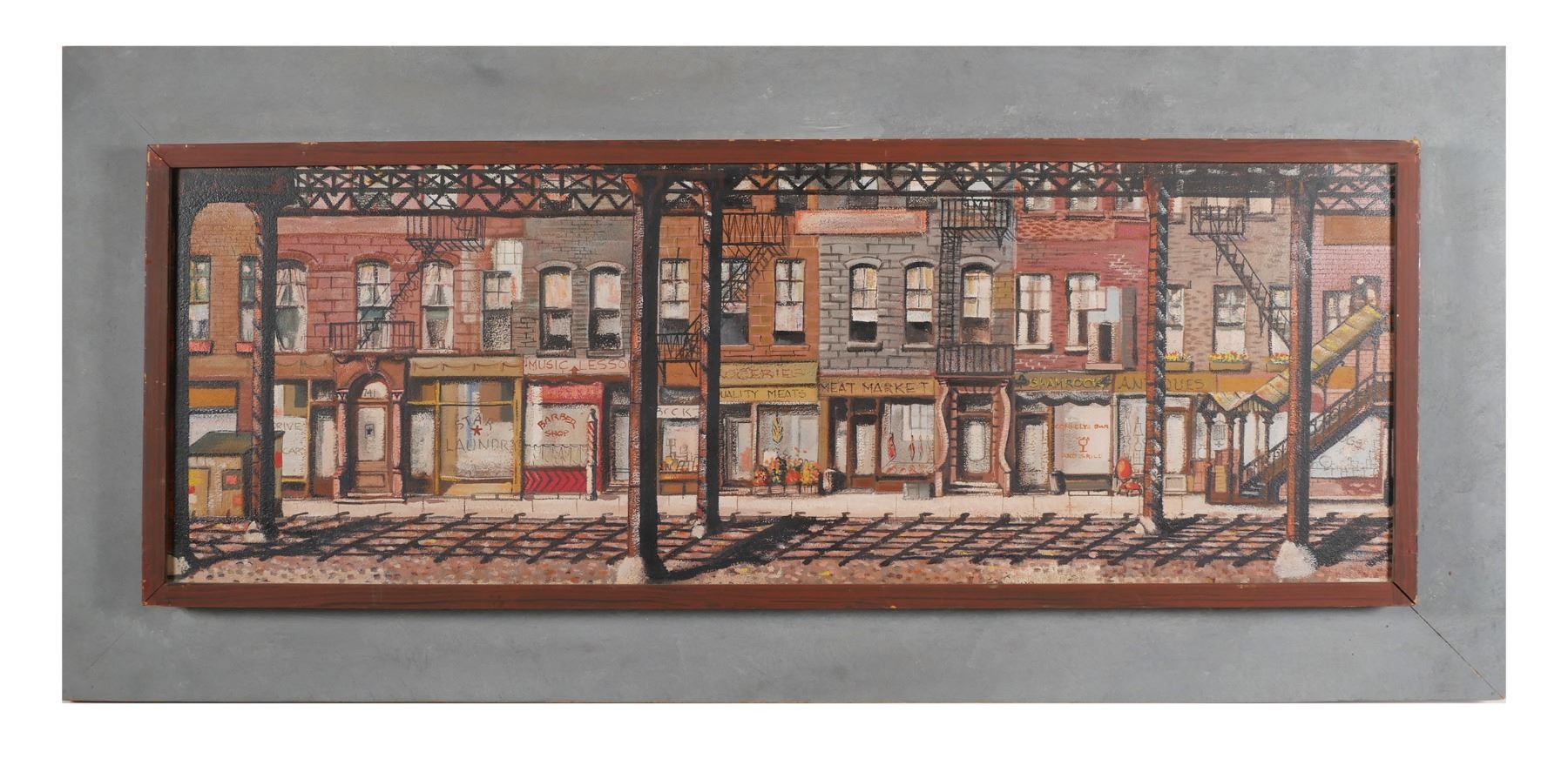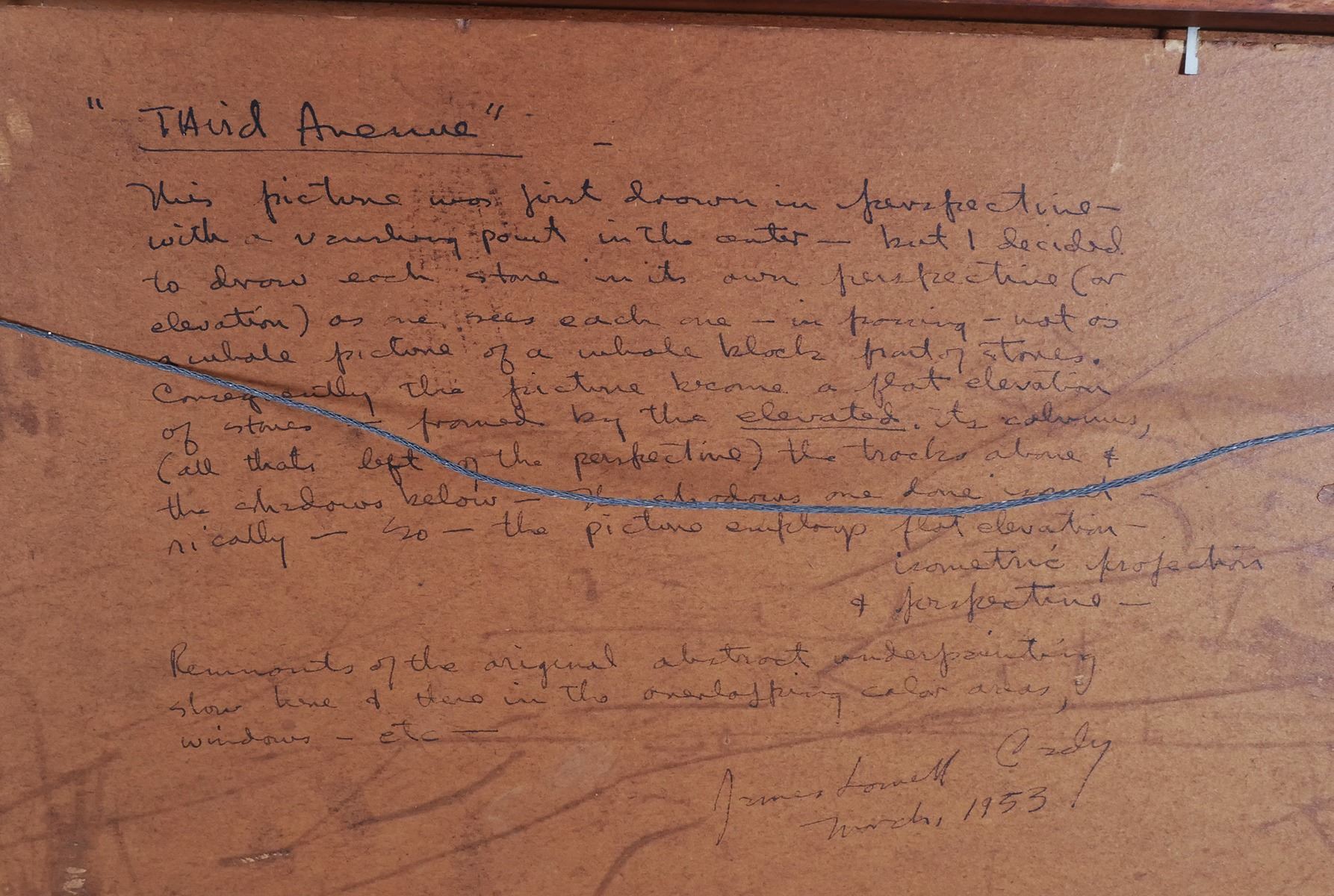 Oil on board painting by James Lowell Cady, titled "Third Avenue" with signature and lengthy description verso. Dated 1953. Image shows the New York City Third Avenue Elevated Train with shops beyond. Board measures 40" x 14", framed to 48" x 22". Excellent condition with no damage or repairs.