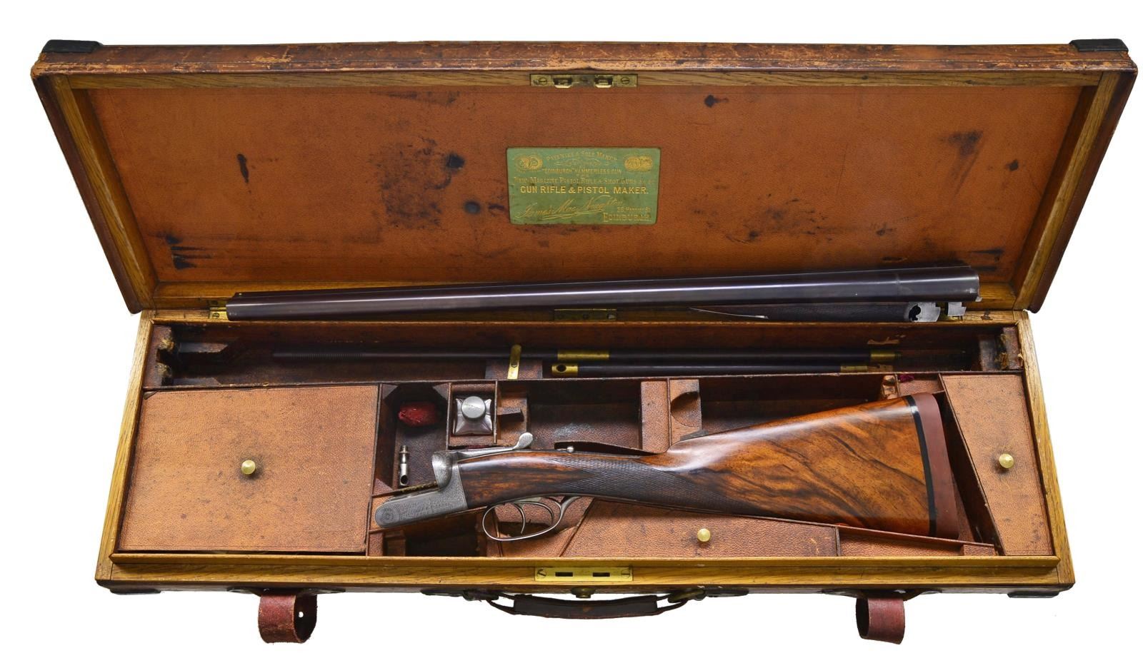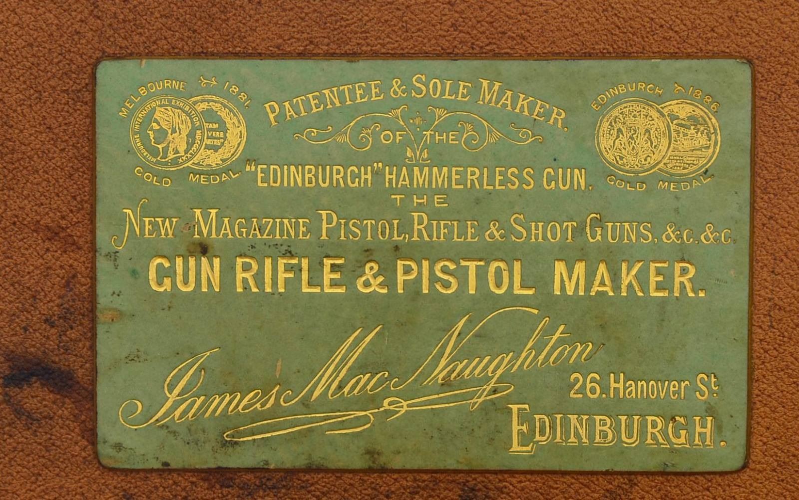 ORIGINAL CASE. Cal. 12 Ga., 2 3/4". S# 1533 (made 1897). Bbl. 26" monoblock, engraved "James MacNaughton Hanover St. Edinburgh" on Damascus game rib. Bbl. flats stamped w/ London black powder proofs & "12 Ga. 2 3/4". Nitro proofed "E.A. Lander Grafton, N.H." Rnd. bar trigger plate MacNaughton action (patent use #231) is fitted w/ short top lever (bbl. cocking). Also features crystal window to view tumblers, toggling top tang safety, 3rd fastener & double triggers. Action engraved w/ 80% coverage, sm. well cut scroll w/ "MACNAUGHTON EDINBURGH" on fences. S# is on long bottom action tang. Nicely mottled & lightly figured European walnut straight grip buttstock measures 14 3/8" over brown Decelerator pad. Stock features point pattern checkering & vacant gold oval. Matching splinter ejector forend is marked w/ MacNaughton patent use #42 on iron (in reference to their unique ejector system) & forend detaches w/ forward pivoting lever release. MEASUREMENTS: BARRELS: Bore diameter: R 725 L 724. Restriction: R .012 (strong IC) L .017 (MOD). Min. Wall Thickness: R .028 L .025. STOCK: LOP: 14 3/8". DAC: 1 9/16". DAH: 2 1/4". Cast: Neutral. WEIGHT: 6 lbs. 16 oz. UNATTACHED ACCESSORIES: gun is housed in its original oak & leather case w/ brass corners. Interior is lined in brown pigskin as is normal for Scottish guns. Gold embossed green cardboard MacNaughton label is in lid. Case contains a Hawksley marked crystal oil bottle, 3 piece mahogany & brass cleaning rod, rosewood handled chamber brush, a Turk's head cleaning brush & some mops, as well as a pair of James Dixon powder & shot measures. CONDITION: very good as partially refurbished. Bbls. retaining over 80% rust blue as applied at time of sleeving. Action contains a considerable amount, perhaps 30 - 40% original light case hardened colors, mostly where well protected. Engraving remains very fine. Stocks retain most of an older oil refinish over some staining & marks w/ a good scattering of subsequent marks. Checkering is worn & has not been recut. Bores are excellent, action is tight, bbls. are slightly off face. Ejectors are in time, but often do not cock & are live. Case leather is considerably soiled, scuffed & marked. Handle & straps are renewed & good. Interior leather has darkened in bottom compartment & has numerous stains from contact w/ gun & access. Lid label is clear, somewhat soiled, but does not have any chips or scrapes. Partitions are good, bbl. length partition is loose. Most compartment covers are present, access. are good. (01-18168/MGM2). ANTIQUE. $2,500-5,500.